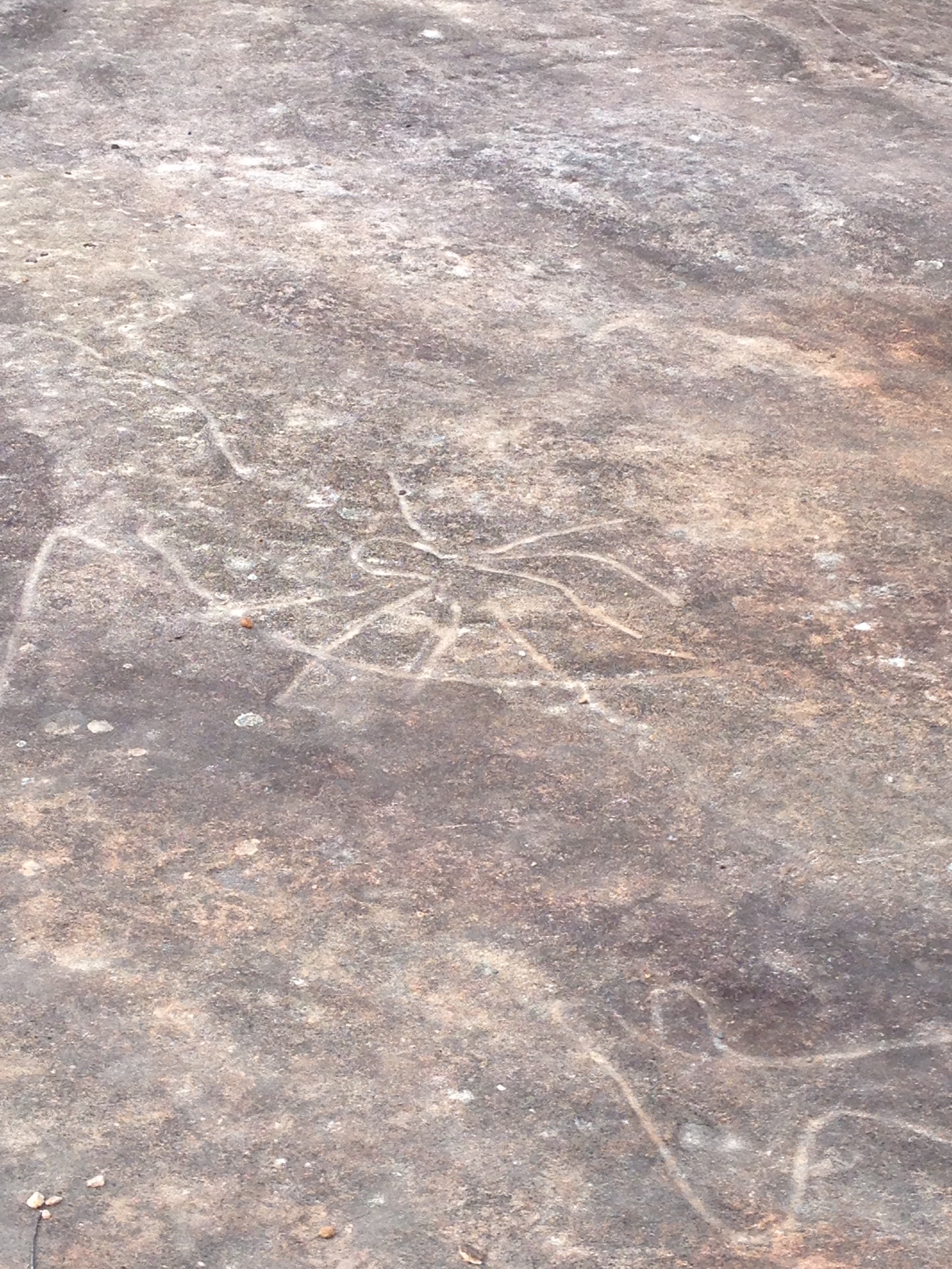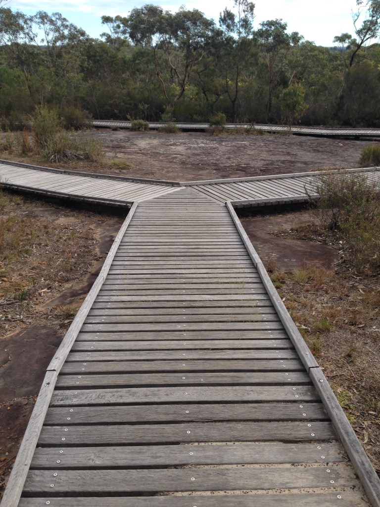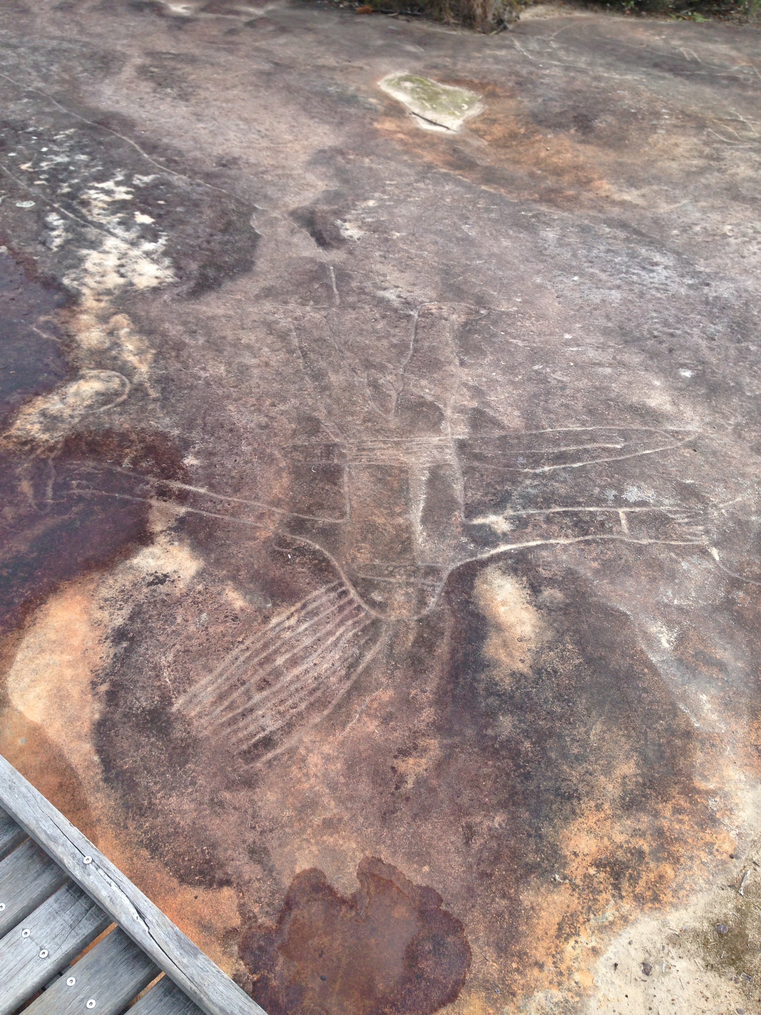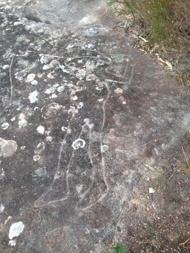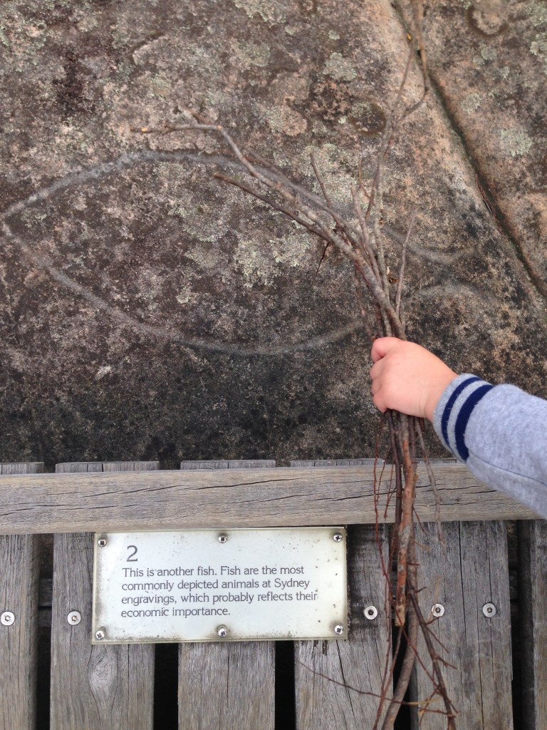 We had driven past the entrance many times on the way to Umina beach and playground so it was awesome to stop and check it out. The site was encircled by boardwalk to try to keep people from walking over the surface. The kids loved exploring the bush (wattle is blooming) and my youngest shouted out whenever we saw a new shape on the flat sandstone canvas. The scene depicted was apparently a hunting scene and we saw wallabies, fish, Dolphins (or large fish) and two human figures, one of which was Bulgandry man in a ceremonial headdress. We also found a leaf that looked like a bird🙂