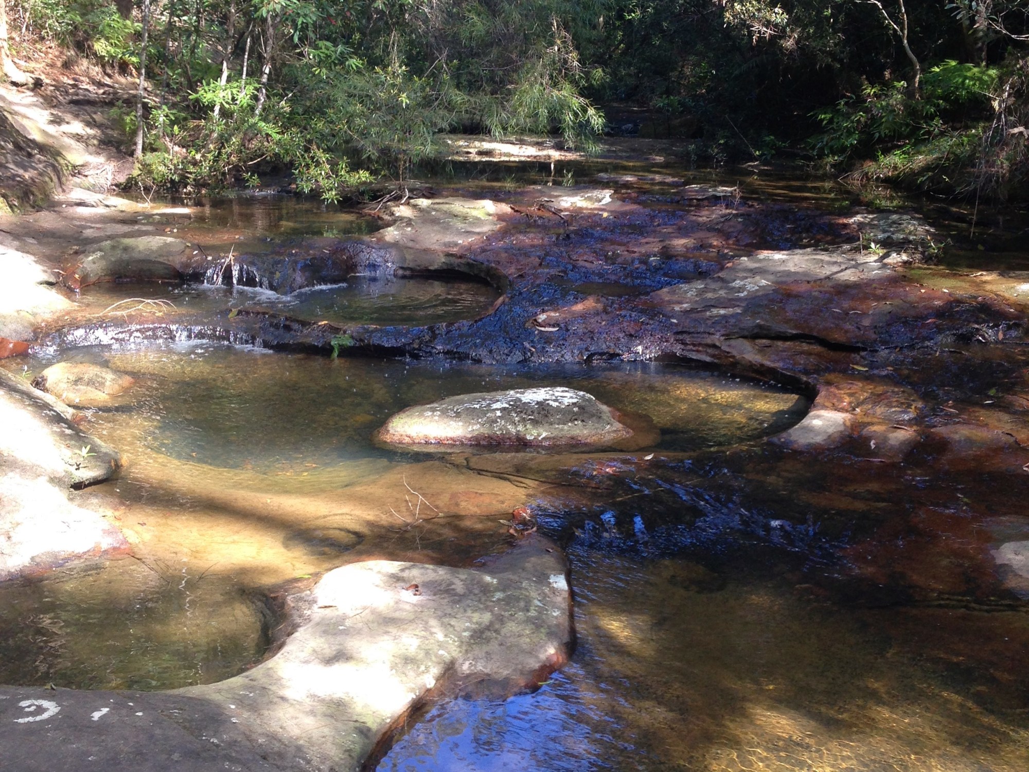 The stream beside me grew wider as I walked deeper into the valley, forming small waterfalls along the way. Eventually the creek (Calna Creek) became wide enough to hold pools wide and deep enough for swimming. At times the trail crossed the creek via steps carved directly into the large boulders that had somehow found themselves in the middle of the water (see pictures below). Interestingly the boulder size grew as I descended, reaching the scale of a large house. Other areas of the creek contained beautiful moss covered stones or  circular pools arranged in a striking pattern. There was a set of large overhangs that could really be considered to be caves as they were big enough to camp inside if one was permitted. I couldn’t take enough photo’s and none of them show it the way it felt.