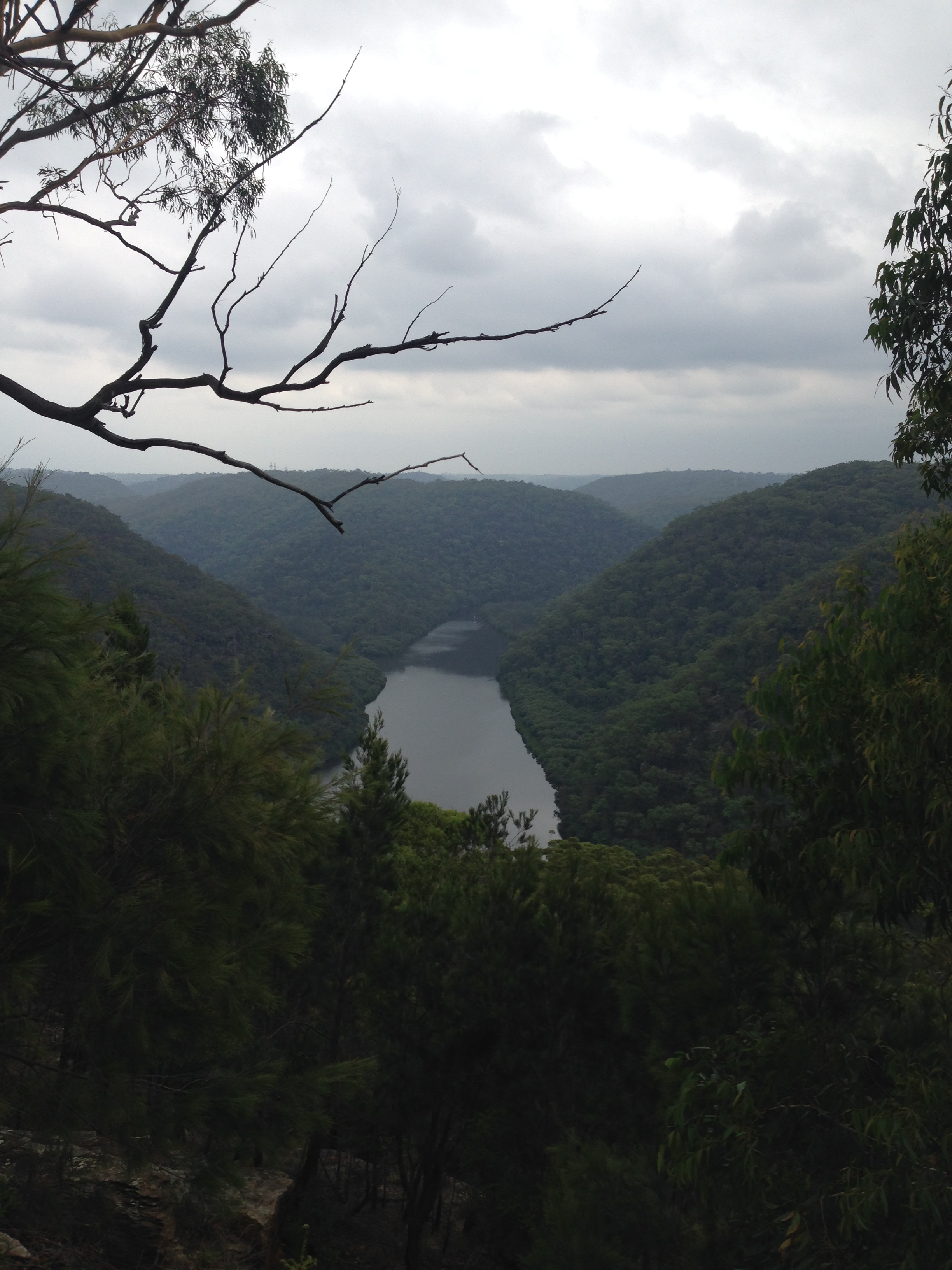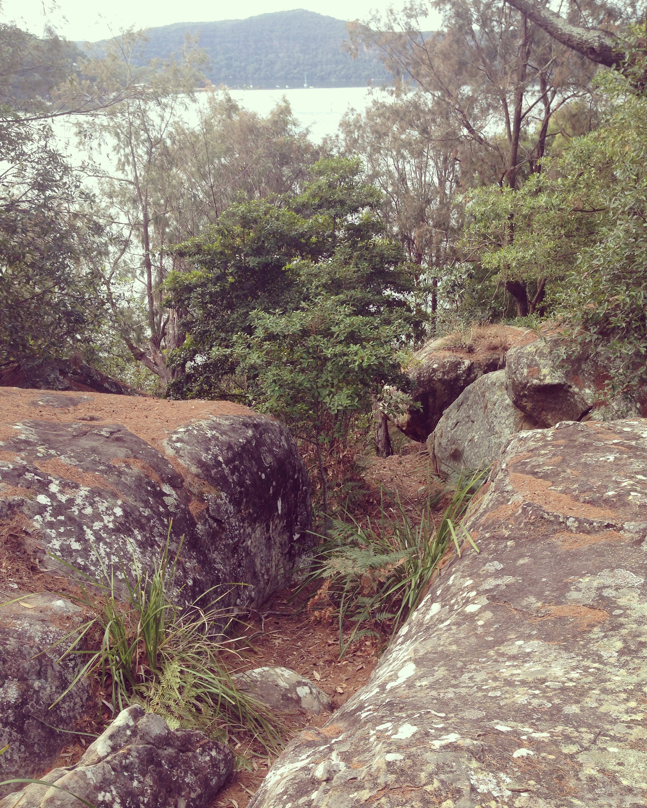 I took my children in the late afternoon as I had finished work early. The walk began with a short climb up some rocks which they loved doing, but it soon levelled out into an easy stroll with a few ups and downs. The vegetation was a little spiky so I had to hold it aside for His Majesty to pass. We spotted a stick insect – the first I’ve ever seen in the wild! The path carried on through some old-man Banksia’s. There was also a section of younger tree’s that had all sprouted at the same time after a bushfire or a spot of back-burning and were all around the same height. The path carried on further than I thought it would but we soon reached the lookout. It was a rock platform with a rather large drop off (so hands were firmly held), and the view was amazing. Berowra Waters and the car ferry could be seen and you could see further along the river to the right. Part of the rock platform seemed to form a bench seating area so Little Miss had us all sit whilst she put on a performance – singing about the bush we had just walked though. The return trip was much quicker somehow. When we reached the end Little Miss decided she wanted to try rock climbing so we spent a good ten minutes going up and down the rocks the hard way!
