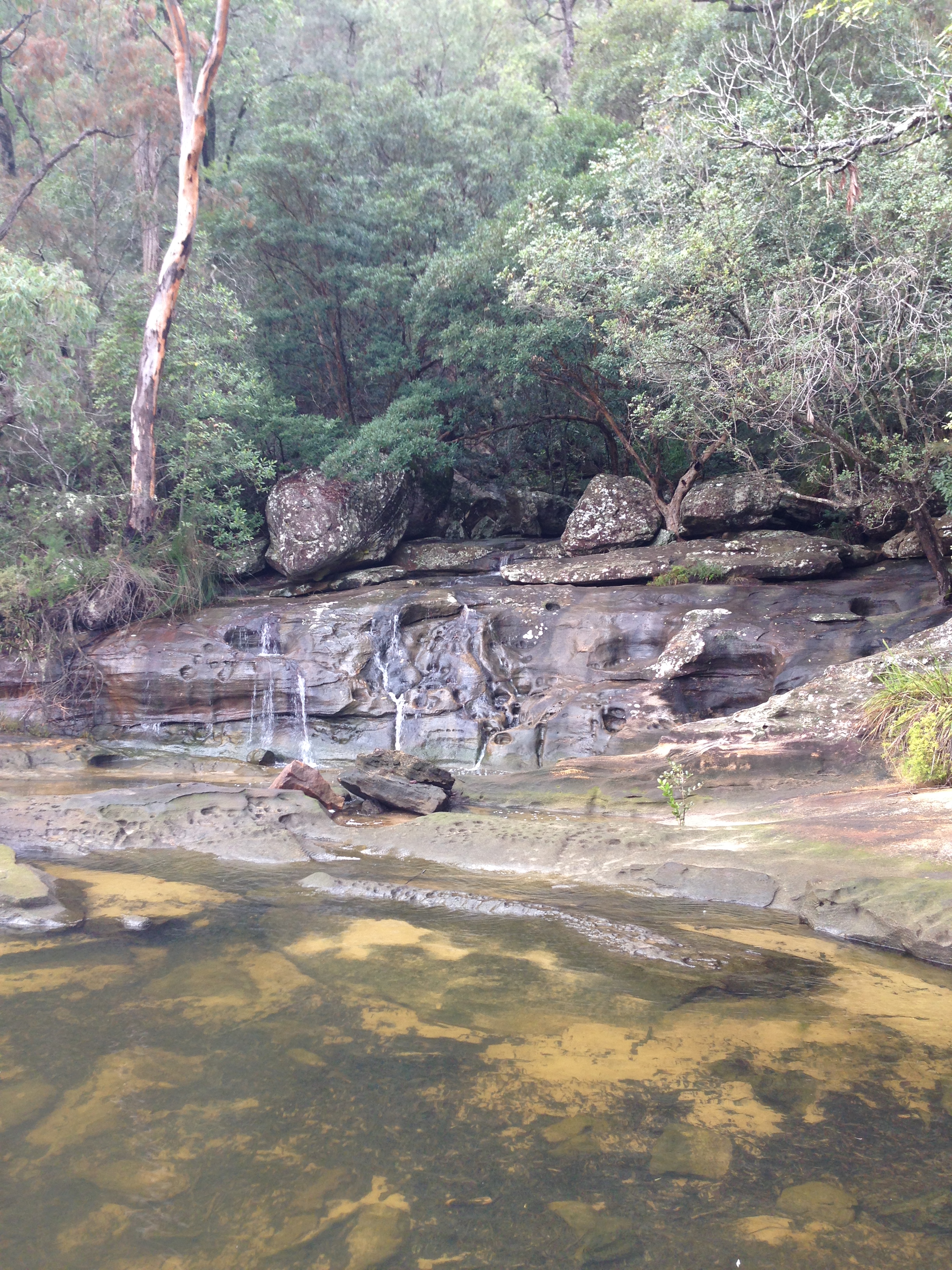 We drove down Berowra waters road from Berowra and parked in the spots before the car ferry. The trail head was on the left side of the ferry and the kids eagerly climbed up the initial rise. After this the trail was fairly level with only a few branches, roots and rocks to keep an eye on. Little Miss discovered an engraving of a fish on a rock. It looks aboriginal but also looks kinda new – I’d love to know for sure but I know I wouldn’t have noticed it without her along! There were also a large number of shell middens – this is where the original inhabitants of the area discarded their used shellfish shells. The walk was fairly easy and we soon reached the stream at Washtub Gully which turns into a small waterfall as it drops into Berowra creek. We made sure to hold hands whilst crossing the stream as it looked quite slippy. We spotted an old jetty on the other side of the stream so made our way to it. The only way down was to clamber down using some old tree roots as footholds. They loved it. The jetty was a great place to snap a photo of the waterfall itself and to explore the water and rockpools. When we were finished, we went back along the way we came and caught the car ferry across the river. We got some chips and had a play in the pirate ship playground then hopped back on the ferry to end the day back at the car. It’s quite a shady walk so can be done one warmer days too.