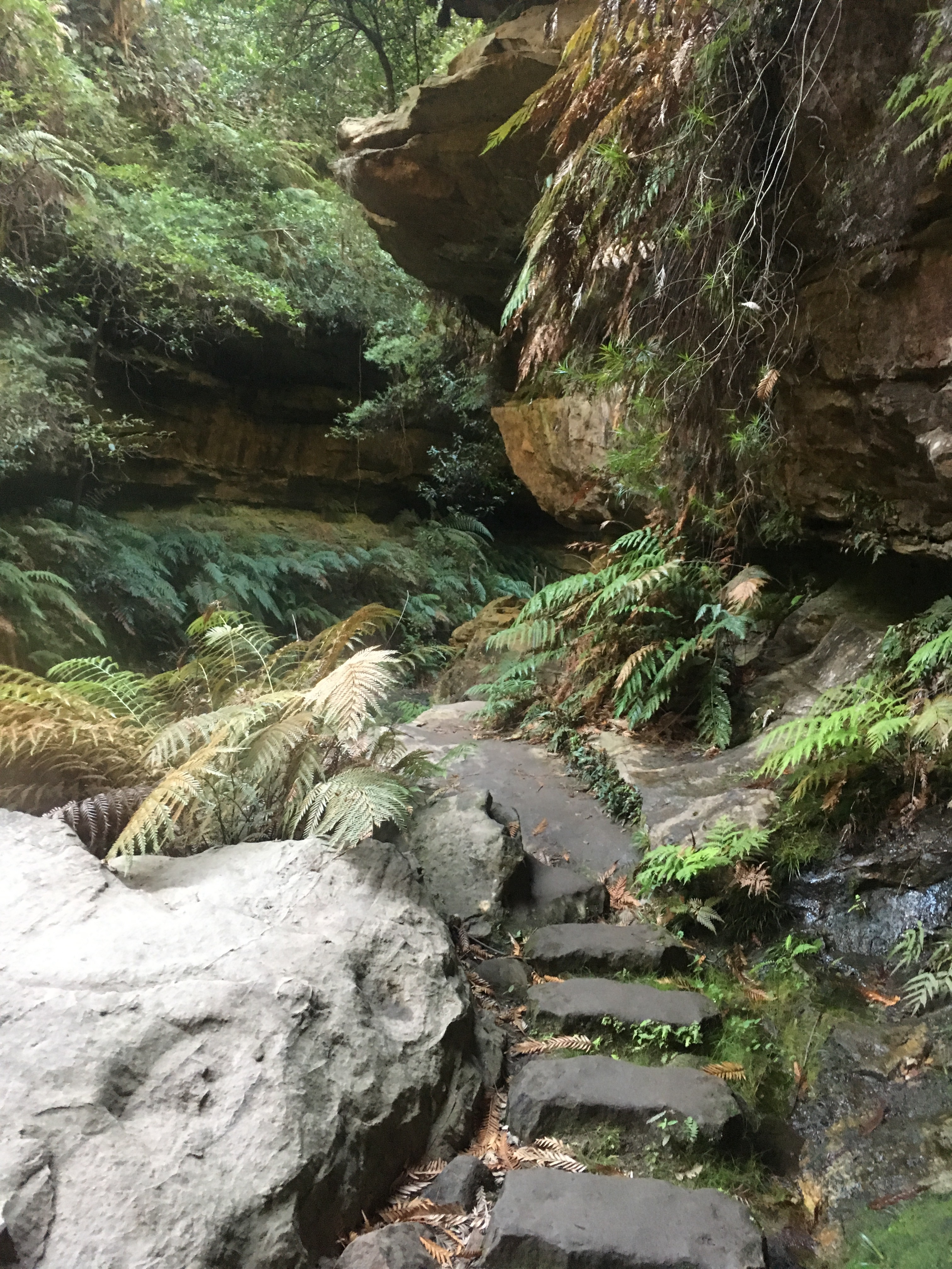 The final part of the walk was along popes glen track. The first part was steep and muddy and I loved finally being able to put my walking poles to some good use (the walk thus far was basically steps and well tended trail so nothing to make you unstable). My new north face hedgehogs also managed the wet terrain with ease and left me with zero blisters for the day. Very happy. The track soon became quite scrubby and I really wasn’t liking it until I came to a sign that said that this was an area of regeneration so all was forgiven. There was a creek running through and I Criss crossed it a few times. The ferns suddenly became quite tall and I was back out on the road again. I strolled along the road to blackheath station, kicking the autumn leaves out of the way. I had a fifty minute wait for my train so I popped into another cafe (mikes organic I think it was called). They make good coffee in blackheath!