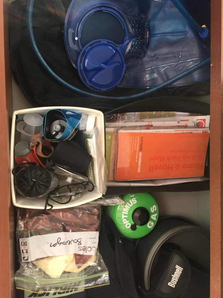 In general I am walking with 11-12kg including food and water. I store all of my main gear in a set or draws that I have taken over in the spare room. This helps me to ensure I don’t forget anything as all the bits and bobs are in the one section. I hope this list was interesting, if not useful. Feel free to comment and let me know of any changes you recommend. I usually don’t walk in summer so some summer hunts would be very handy.