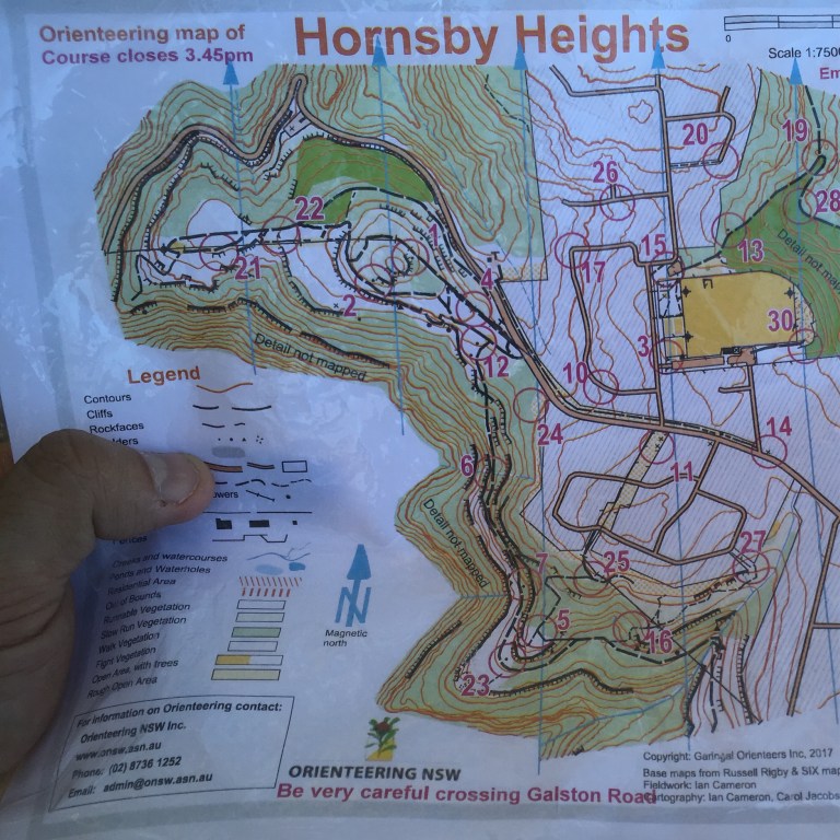 Orienteering NSW recently put on some free orienteering sessions to try to get folks into the sport. So my family headed out to the Hornsby Heights session to give it a go and I have to say it was fantastic! You are given a map with various points marked on it and a timing stick. We had 45 minutes to reach as many markers as possible to build up a score. If we took longer than 45 minutes points were deducted! A few other families that we knew also attended so that was awesome! Once we found out where North was using the sun then the map was easy to follow. We had visions of completing every marker but reality sunk in pretty quickly so we had to plan a shorter course that hit all the high score points we could realistically reach.