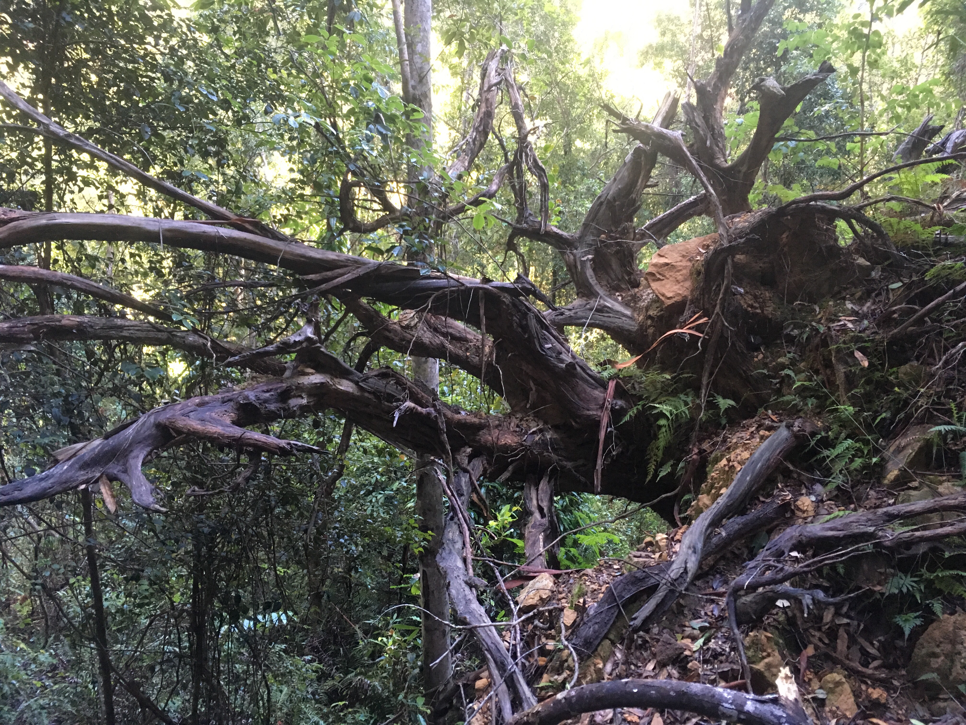I walked back along the Lyrebird trail, able to appreciate it a bit better in the morning light. The forest was lovely and the trees were dressed in vines and looked otherworldly. I still took a very long time to move along the trail given the ups and downs. I now realised I had highly underestimated this part of the trek. I thought it would be a quick link trail but it was an adventure in itself. The tree that had blocked my path yesterday and had caused a slip was no problem this time around as I went over it rather than under it.