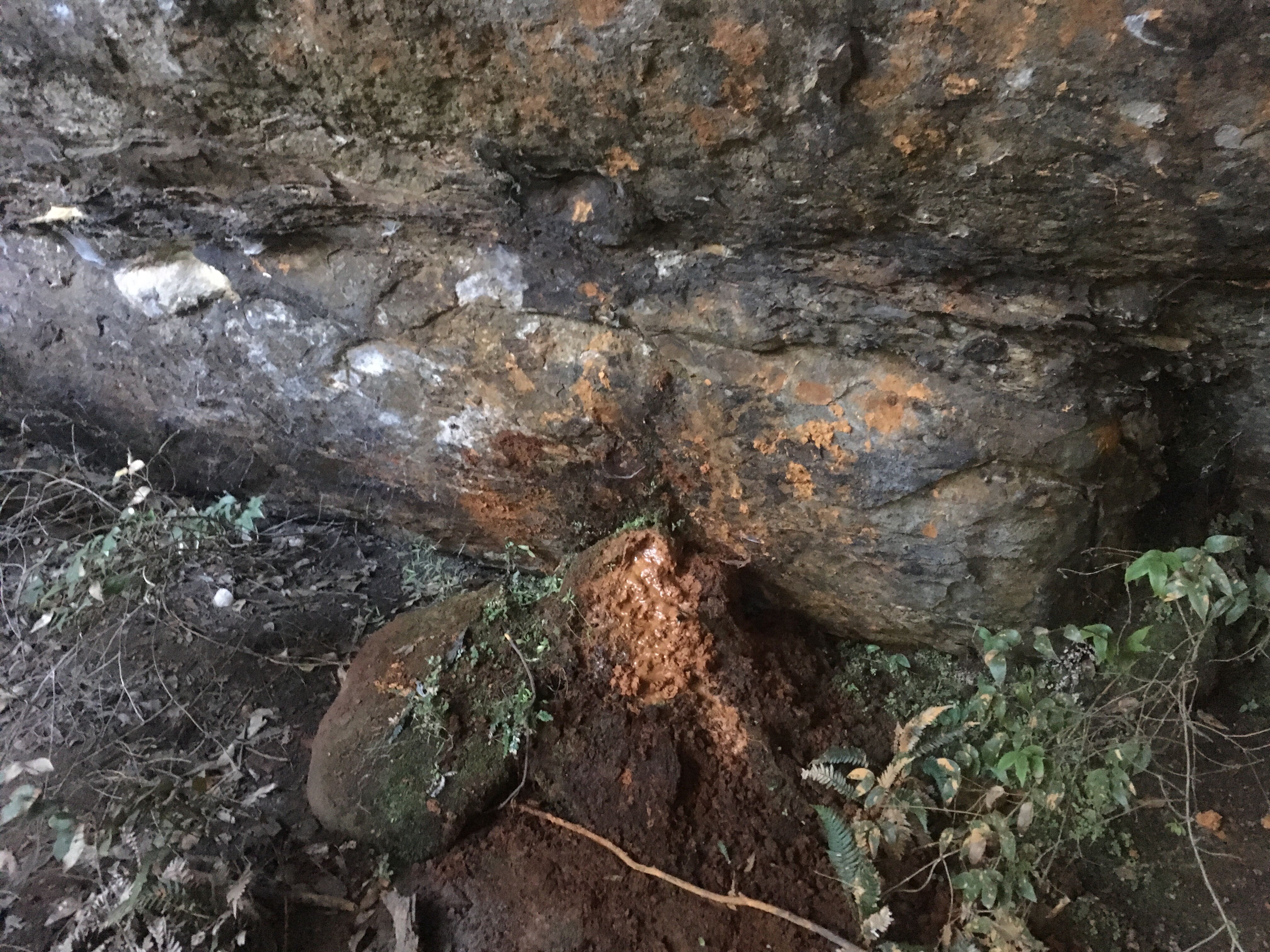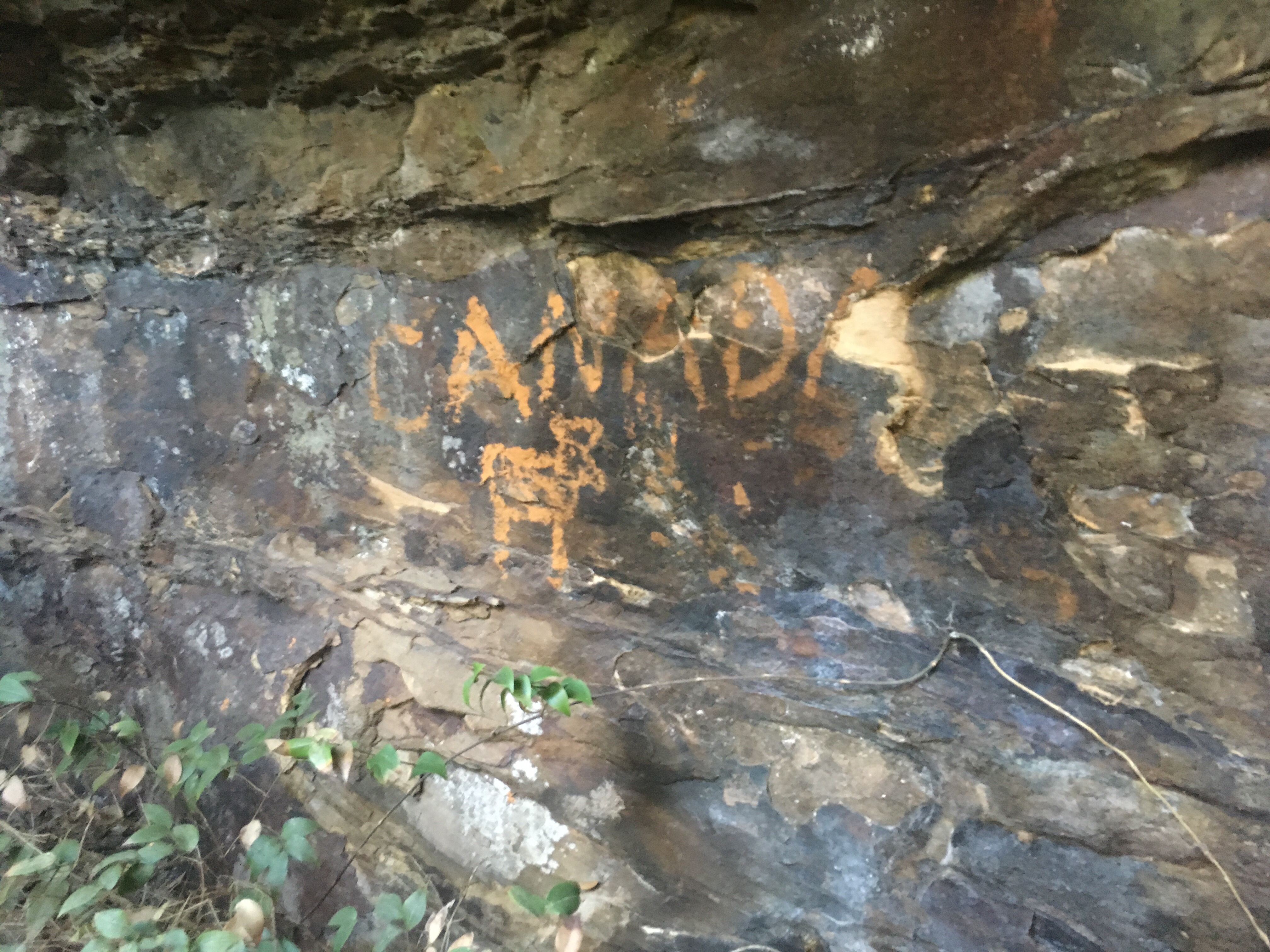 The next gully proved more difficult and I found myself wishing for bridges. After this gully there was a smaller gully and then a walk along the cliff side before beginning a much more difficult descent. The track was quite horrible with lots of small one and two meter rises and falls. It was just hard work. I dragged myself up out of the gullies and cursed the descents knowing full well they would lead to climbs. A large descent took me down to a surprise sandstone cave. I must have missed it in all the notes. It was quite large and one could have used it for shelter if the need arose. There was a section of the rock that was moist and orange and had a stick poking out of it. Someone had tried to create paint from the rock. There were drawings and handprints all over. One of the signs said “Canada” and had a picture of a moose. I don’t know how I feel about that. It feels like graffiti but the fact that some sort of traditional style method was used somehow makes it different, like there is some sort of connection to, and appreciation of, the past ways of living. It was interesting…. It is graffiti… but it was somehow not as bad as a can of spray paint and a tag. I wondered how long it would last.