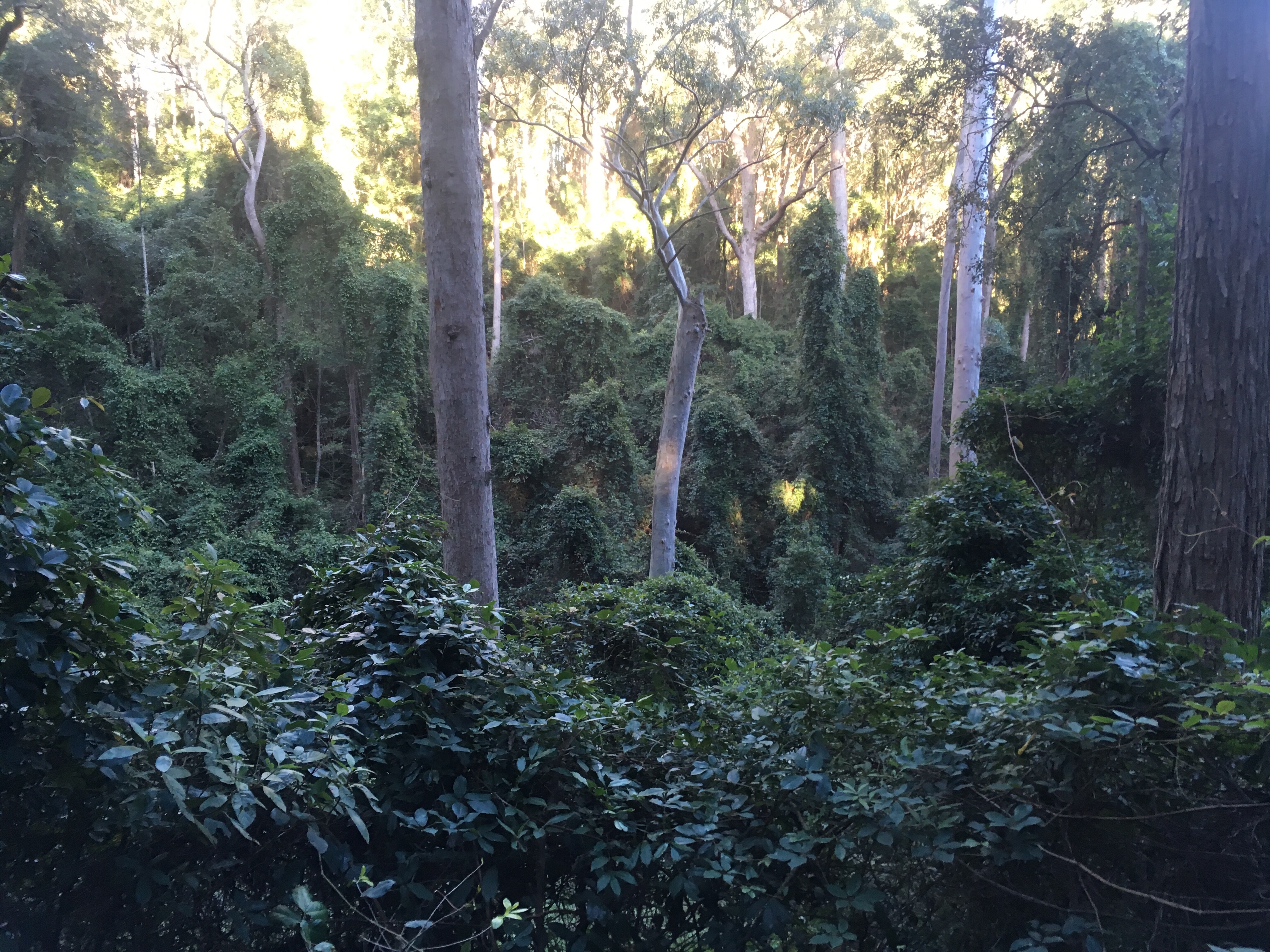 As I was climbing out of one of the gullies a huge black dog appeared on the track ahead of me. One of my emerging fears on the trail is encountering a feral dog. I don’t really know what I’d do. I stood still and tapped my poles together. The dog turned and ran back along the trail, barking. I then thankfully heard an owner and shouted a hello. She held the dog and we had a little chat. She was also out running and told me that she had seen a koala at the next lookout.
