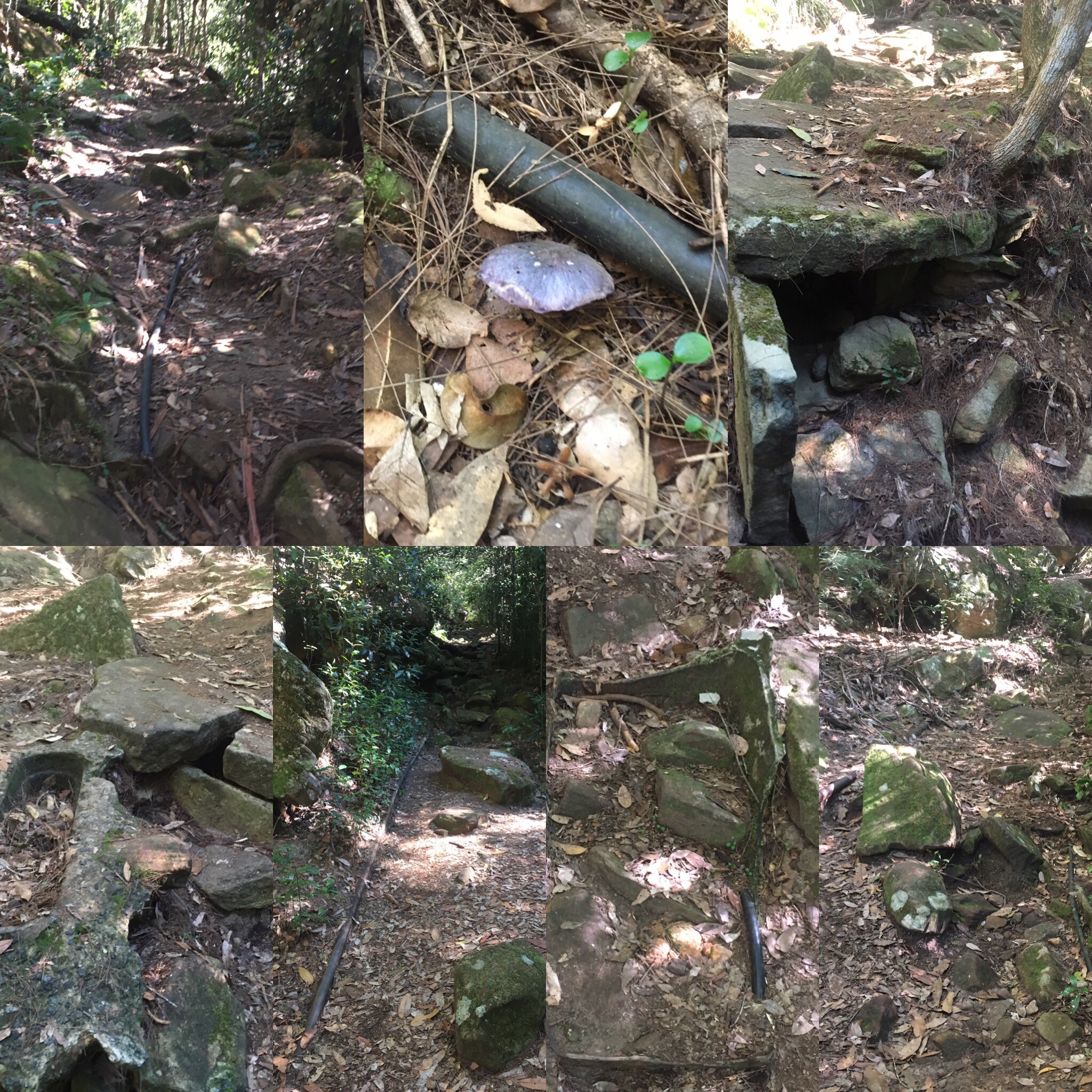 I then came upon a creek where the remains of the bridge stood. There was a pipe crossing the creek and a wooden post was still standing on one side. There were small circular marks on the rock that showed where other posts had been held.