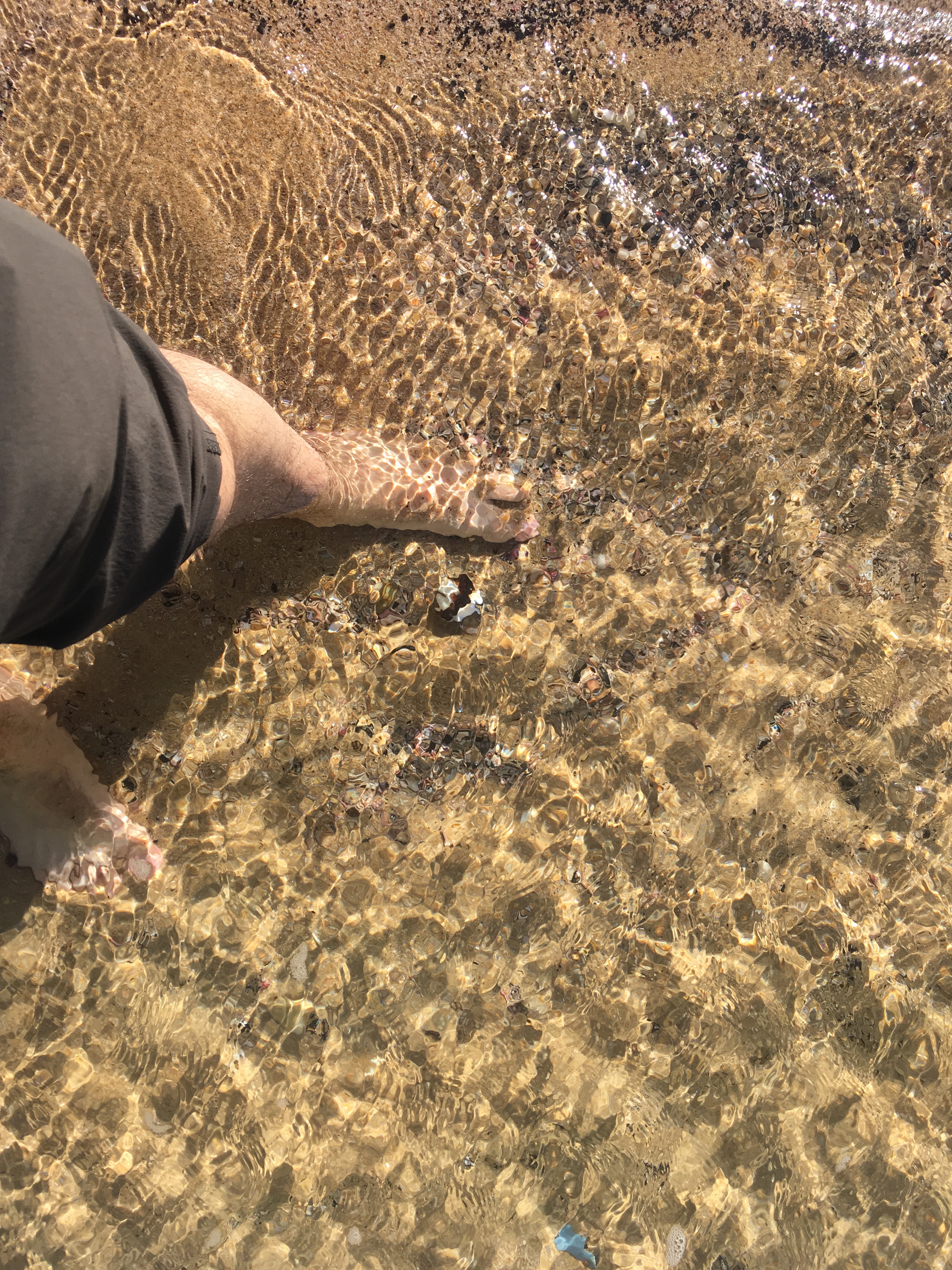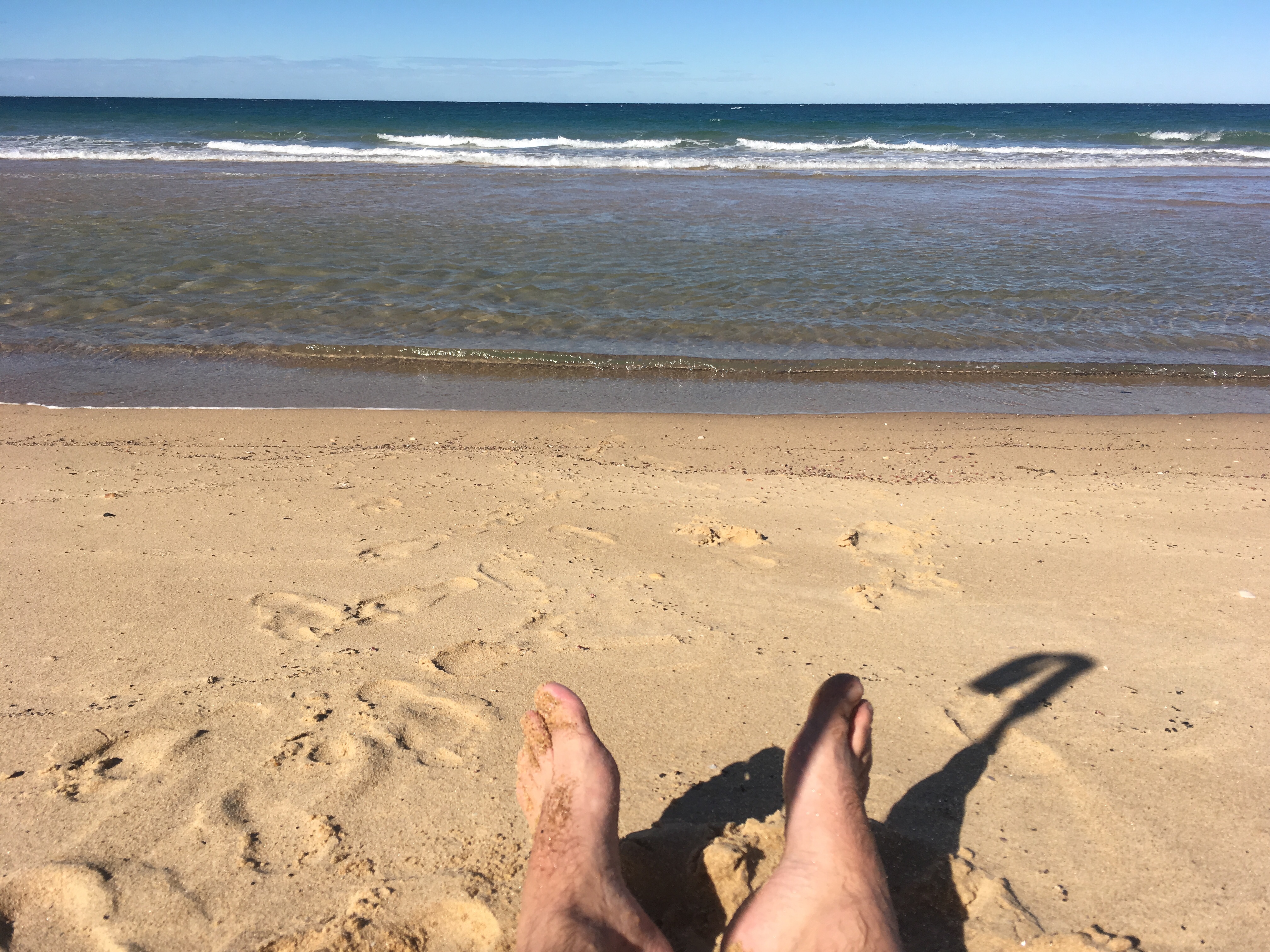 After three hours I came upon a shipwreck just offshore. The wind had picked up and was blowing the sand hard so I put my rain jacket on to shield me. I decided to stop for a bite to eat and found myself removing my shoes, rolling up my trouser legs and going for a paddle. Aaah! That felt lovely! A soak in the ocean was the perfect way to sooth the feet.
