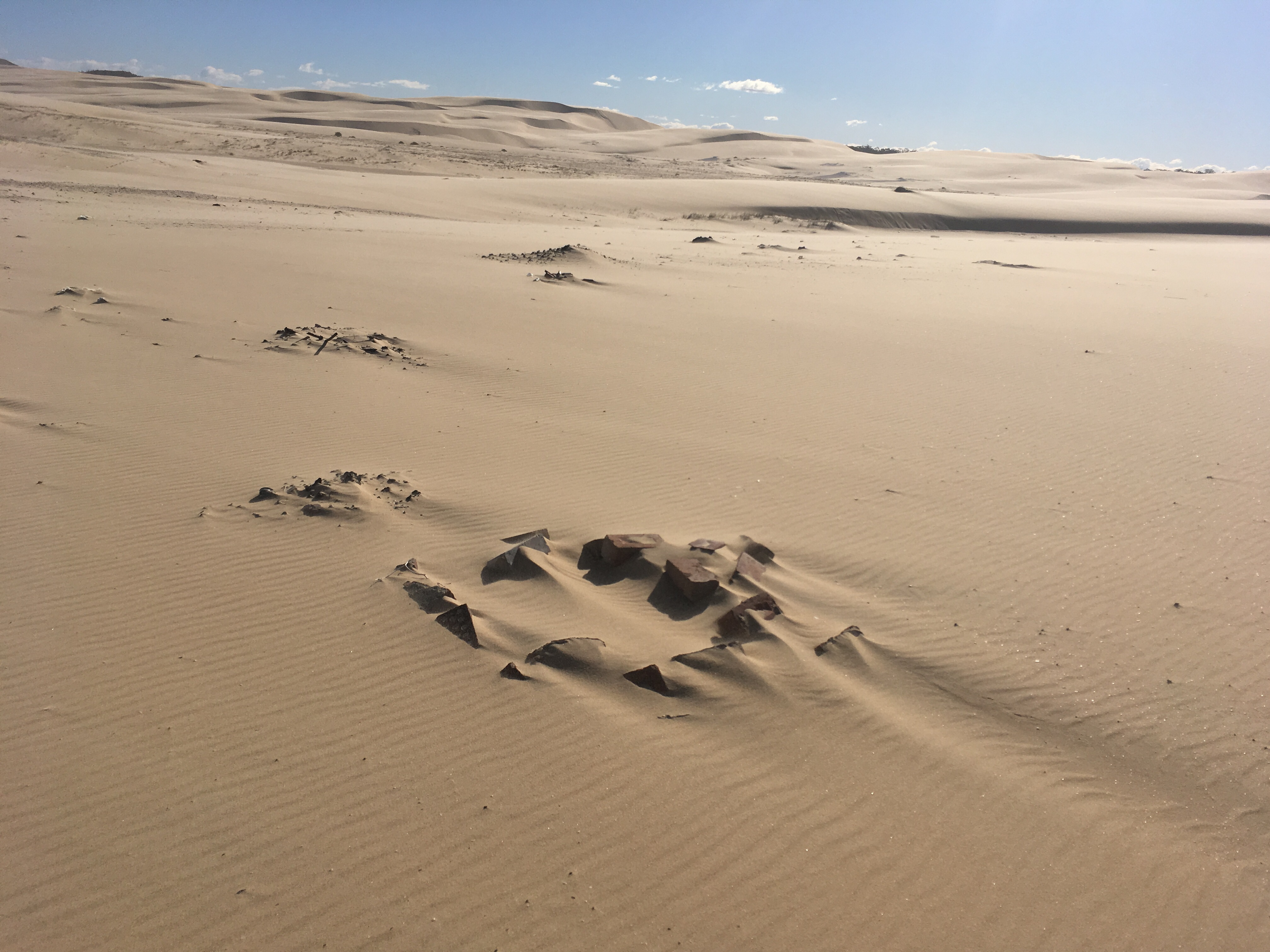 I climbed a dune and ate my lunch overlooking Tin City. The wind had picked up again and I had to move several times to find a little shelter while I ate.