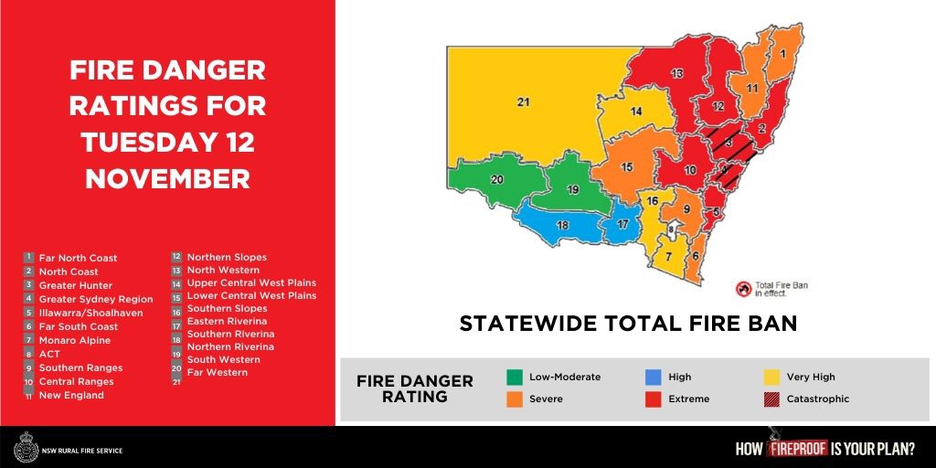Catastrophic fire danger is now forecast for the Greater Sydney and Greater Hunter areas on Tuesday 12 November 2019, due to worsening weather conditions.