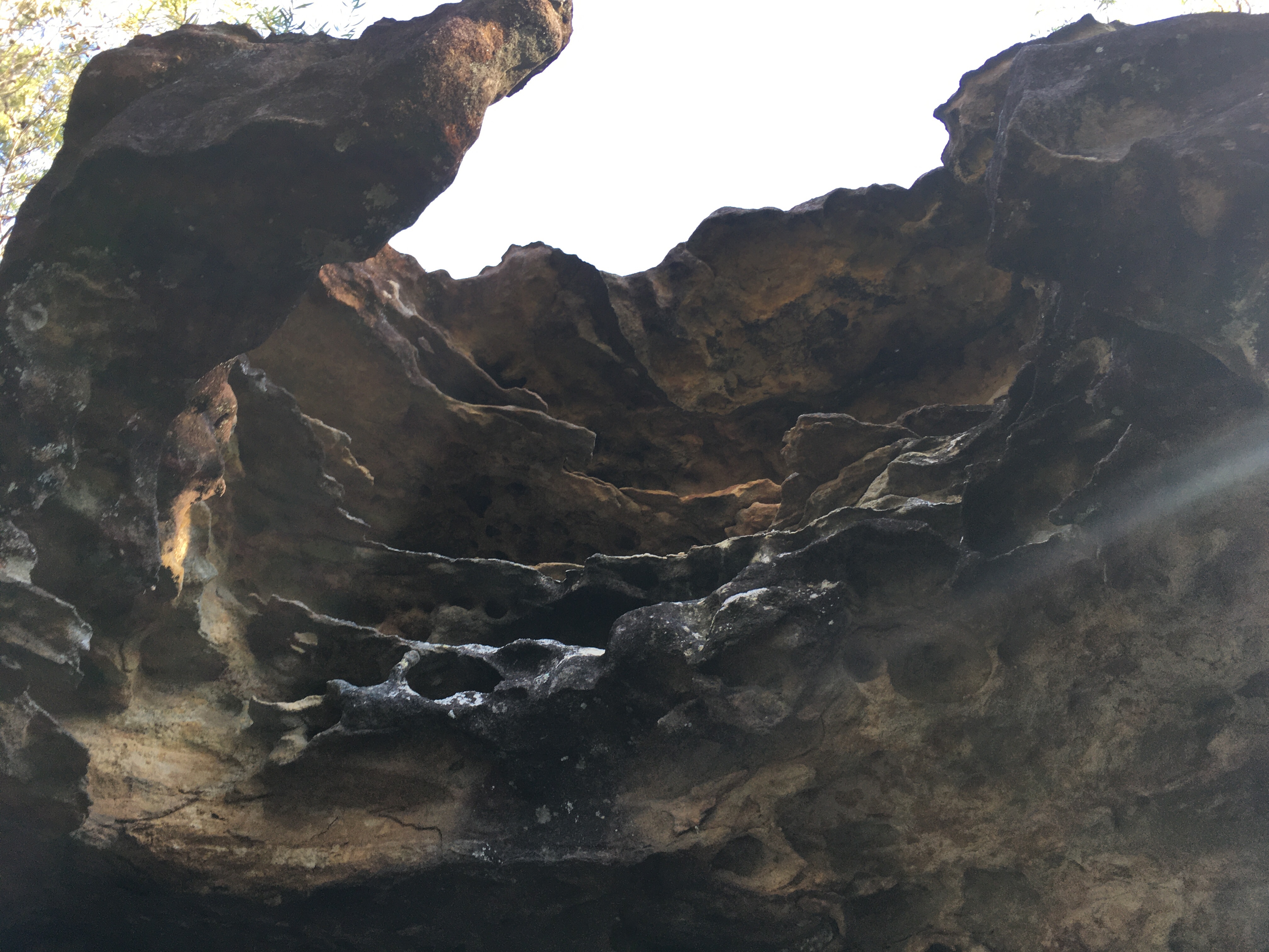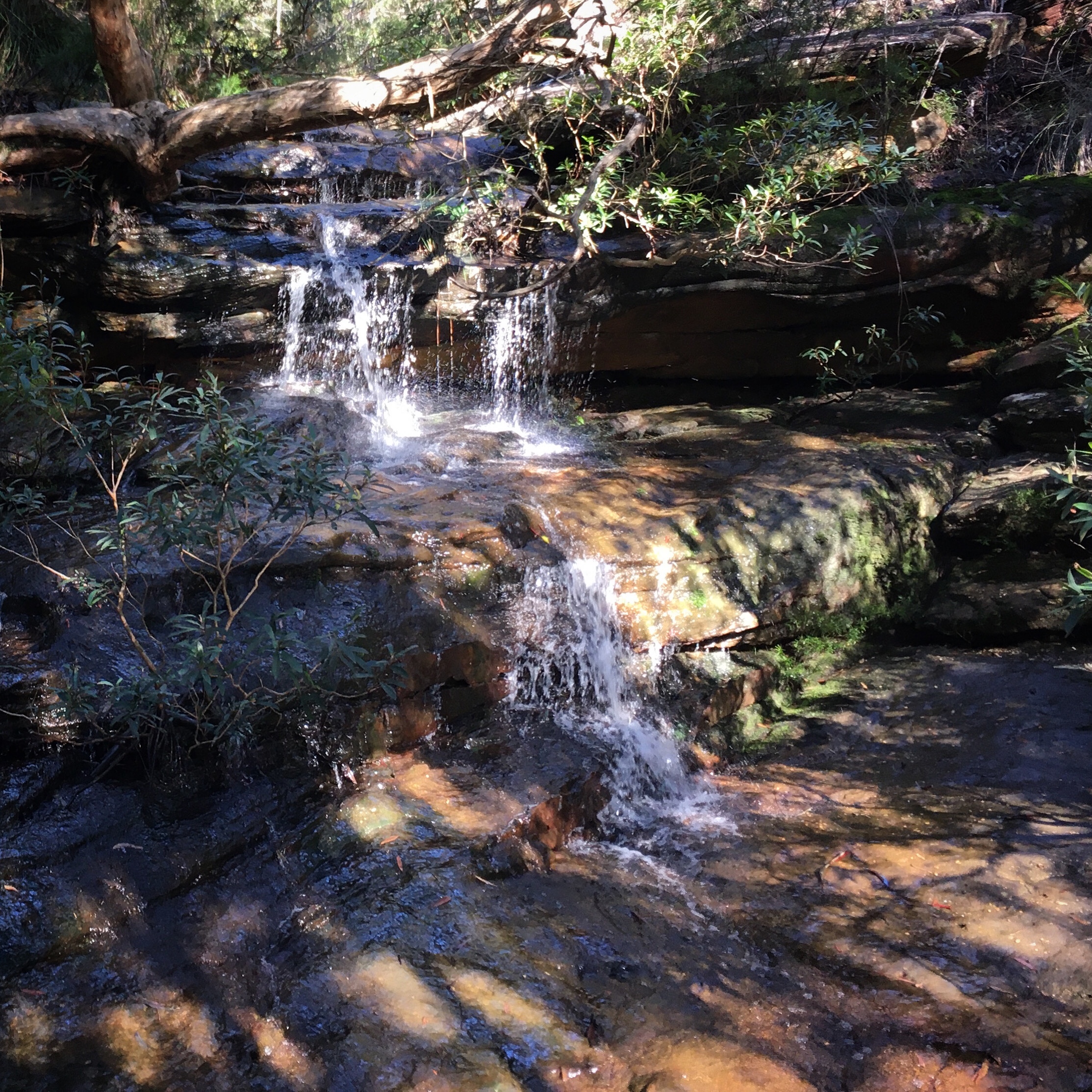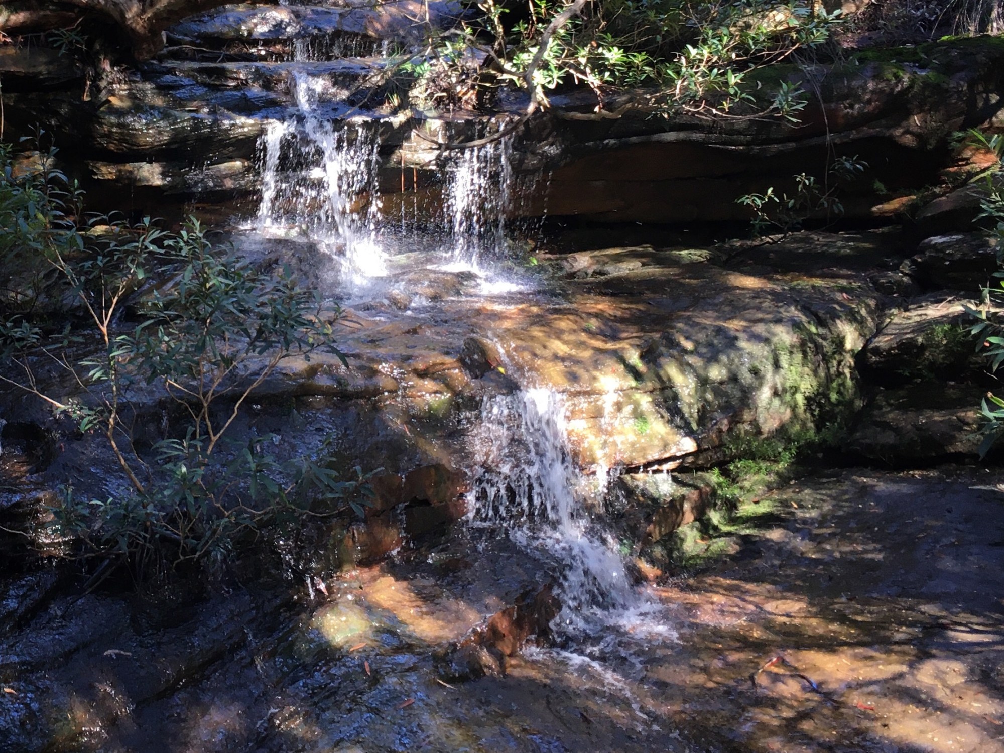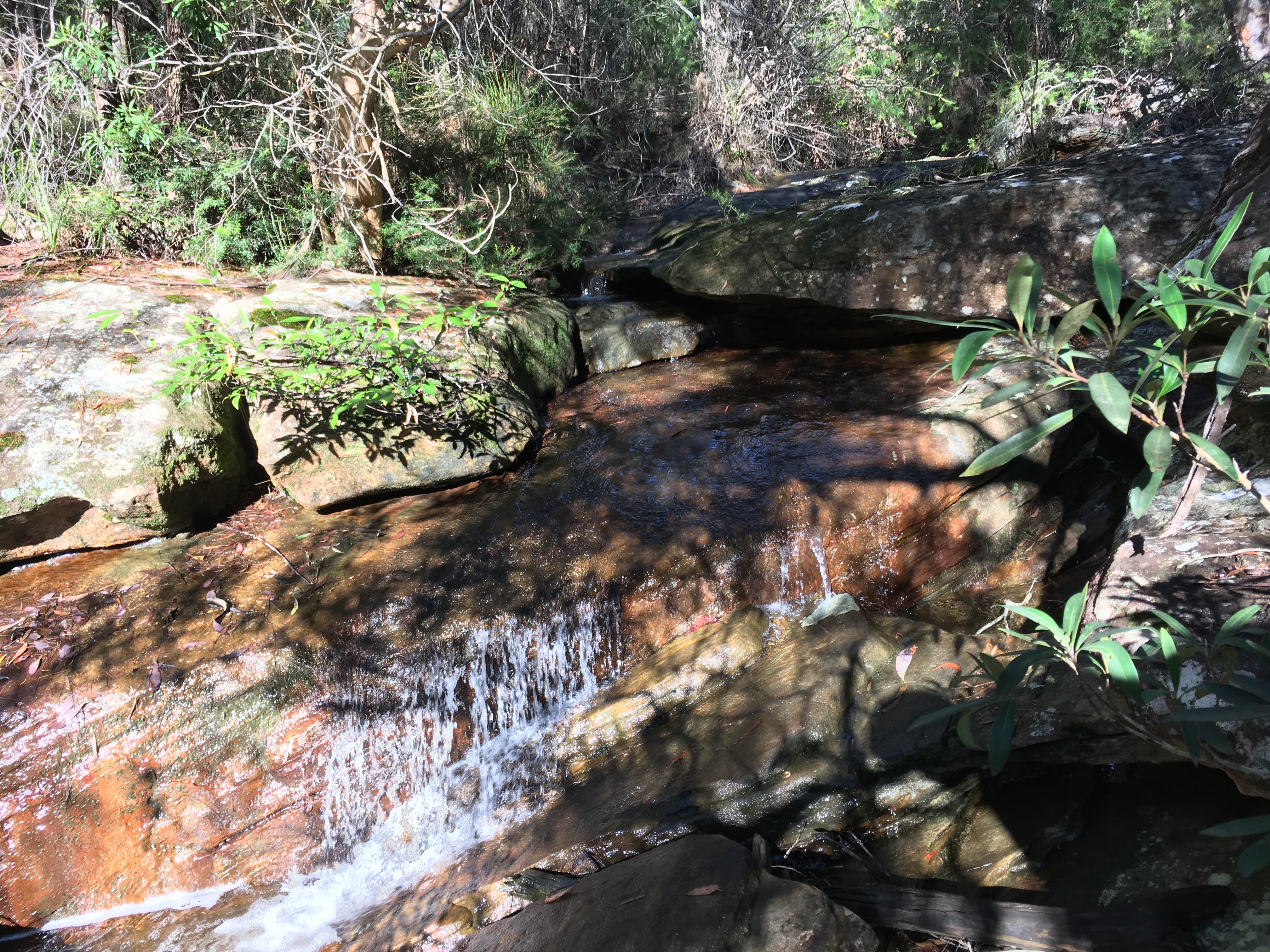 This section of the Great North Walk was very familiar to me so I stormed through it in no time. The rock walls appeared and I veered off, heading down and forward along the gully. I followed whatever natural paths there were and bashed through where the paths ran out. I could hear the water flowing so I headed for the sound. I no time I was at the waterfall in the very spot I had planned to reach! I was quite proud of myself! It wasn’t much of a waterfall but it was peaceful and had a pool at the bottom and rock overhangs surrounding it so there was lots to check out.