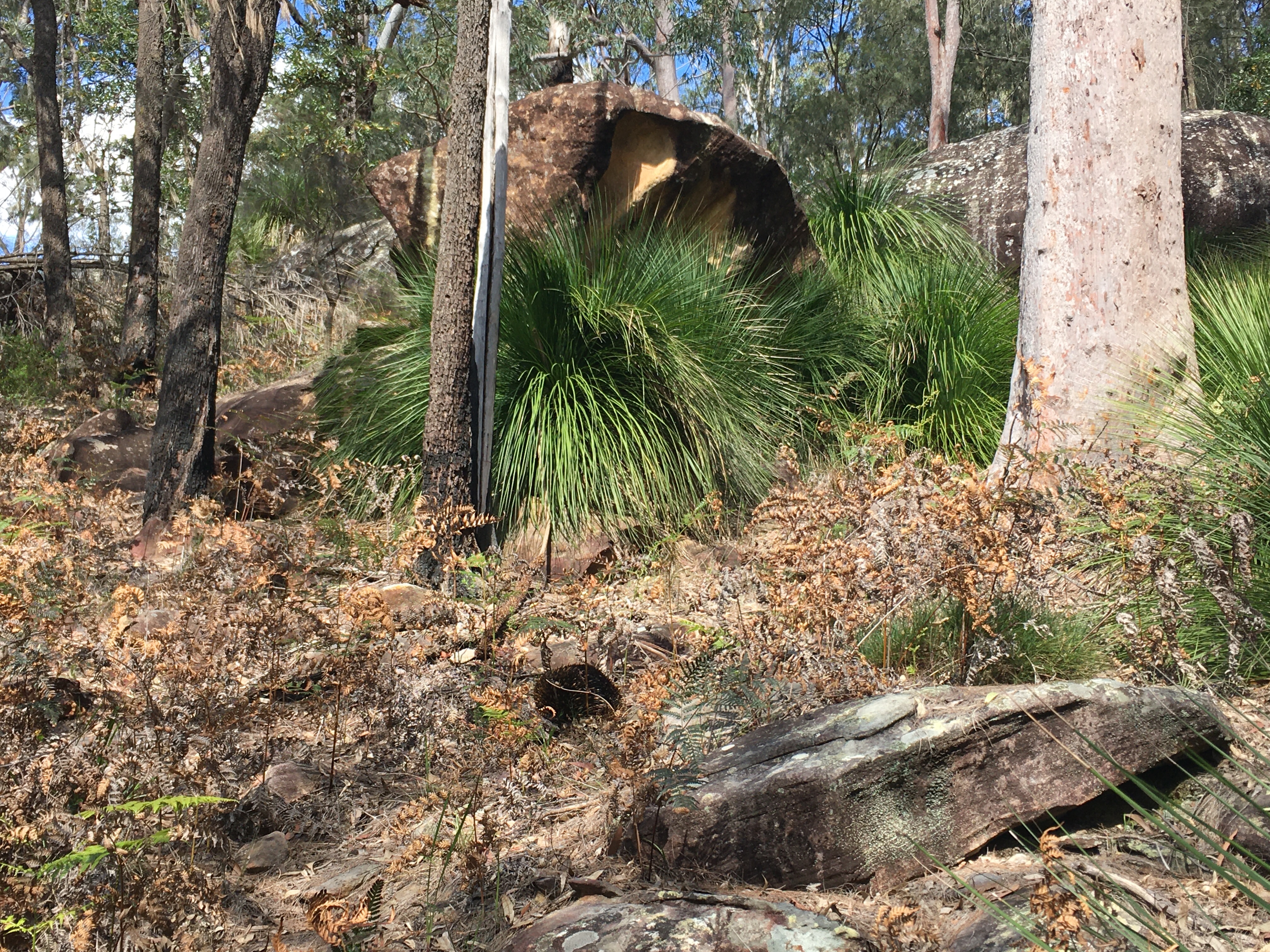 The next part of the walk was pure ridgeline (no more statues) with a changing vegetation, characterised by many grass trees and ferns. The ferns were brown which I found odd given all the rain we had had recently. A little worrying really going on to bushfire season. I found Erina Trig, which I had forgotten was on the trail at that point. The disc structure was missing but a triangular marker had been installed in its place. I really could get into trig-bagging.
