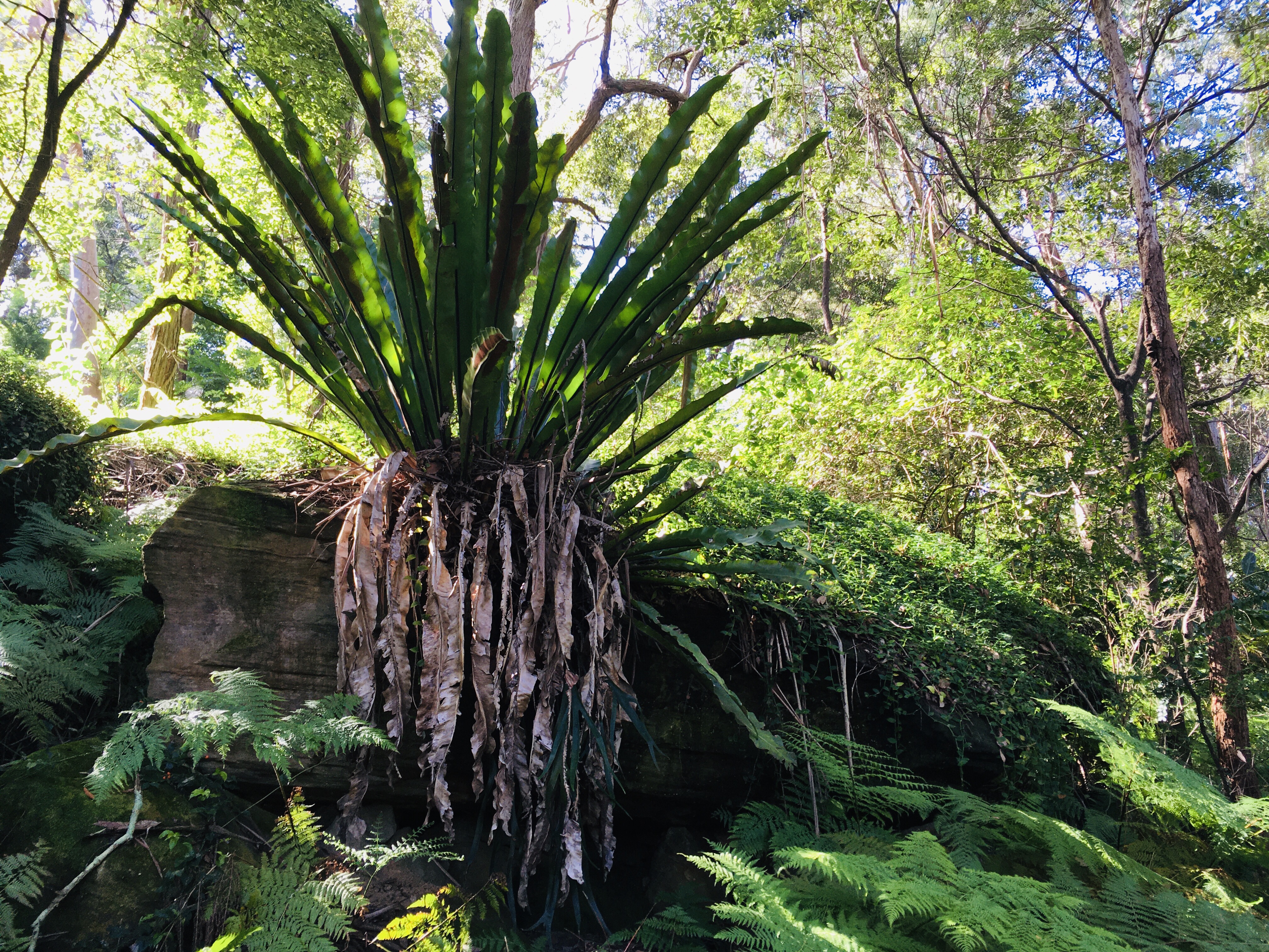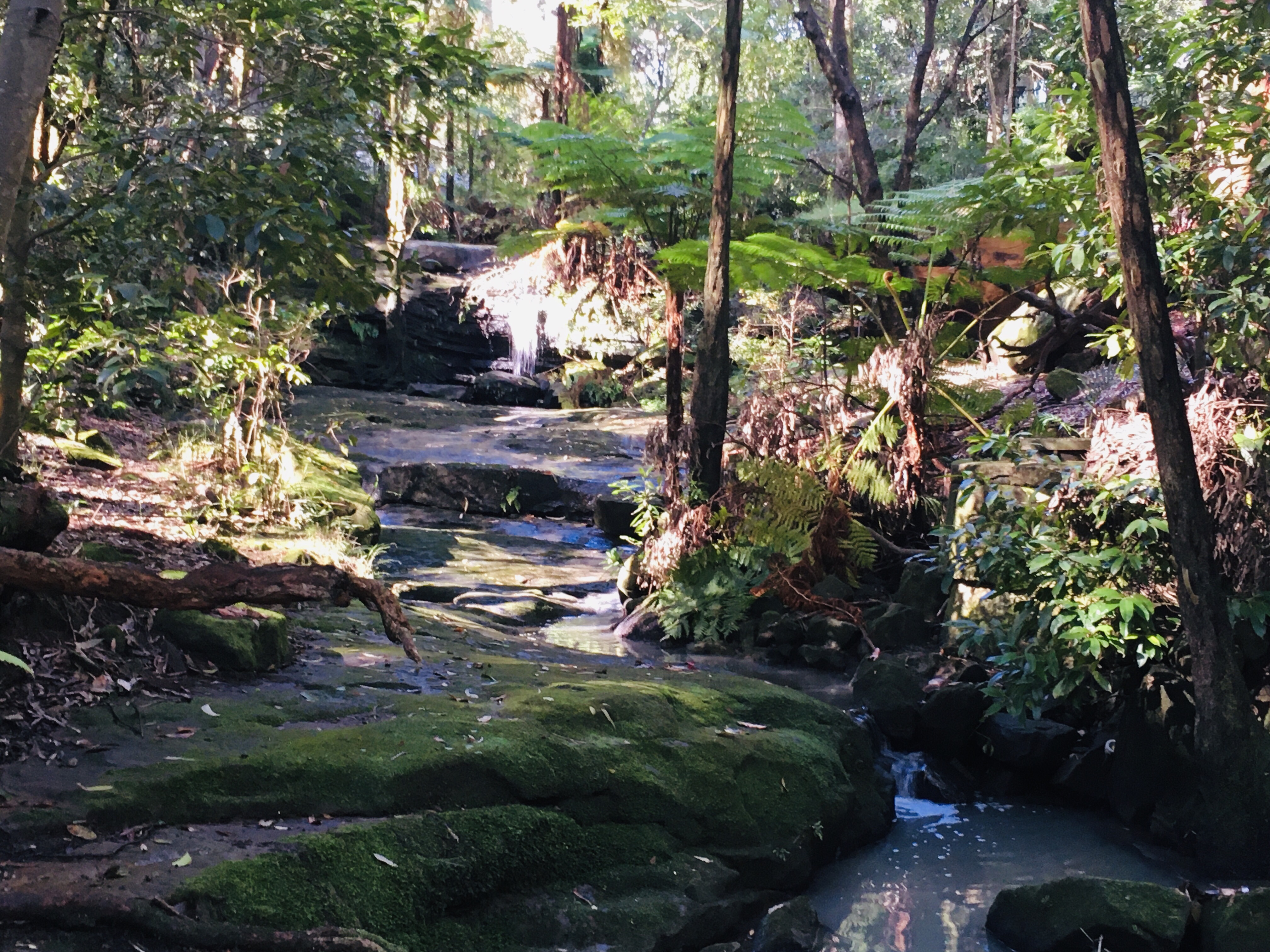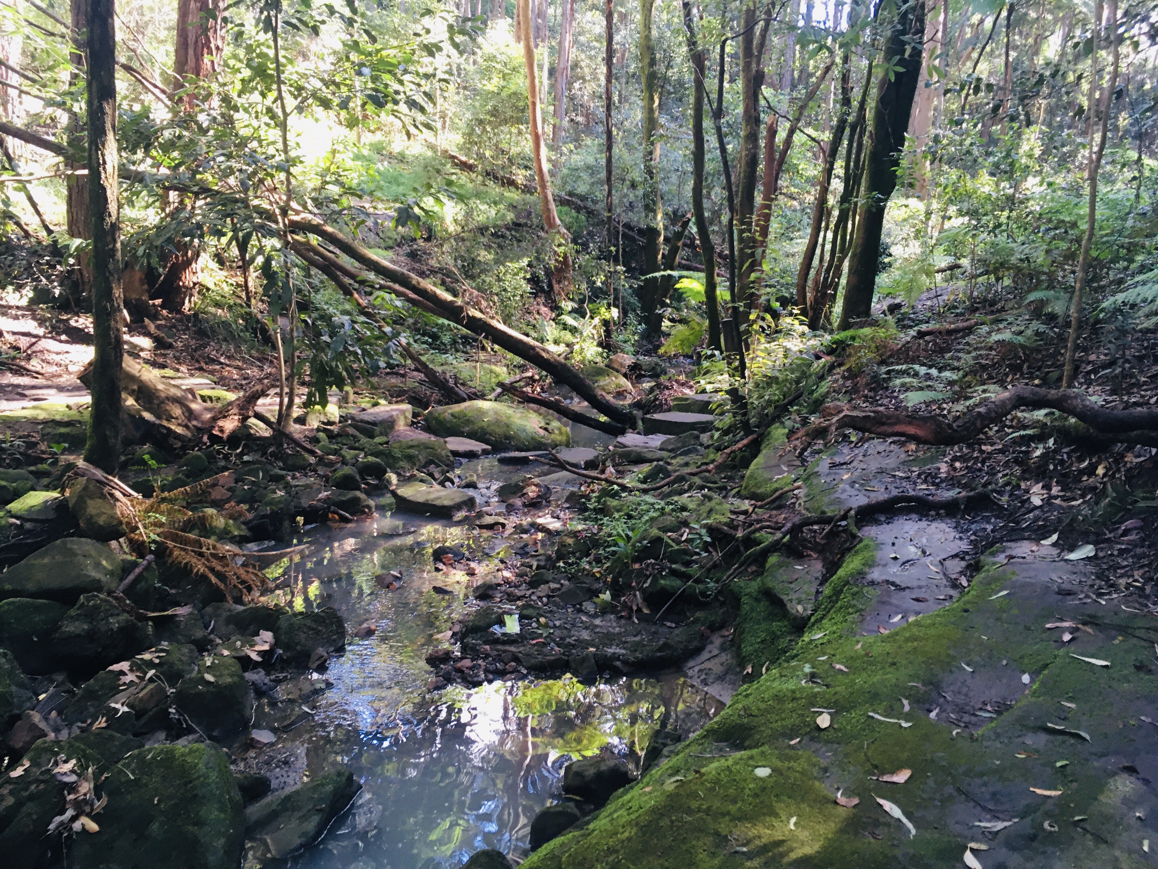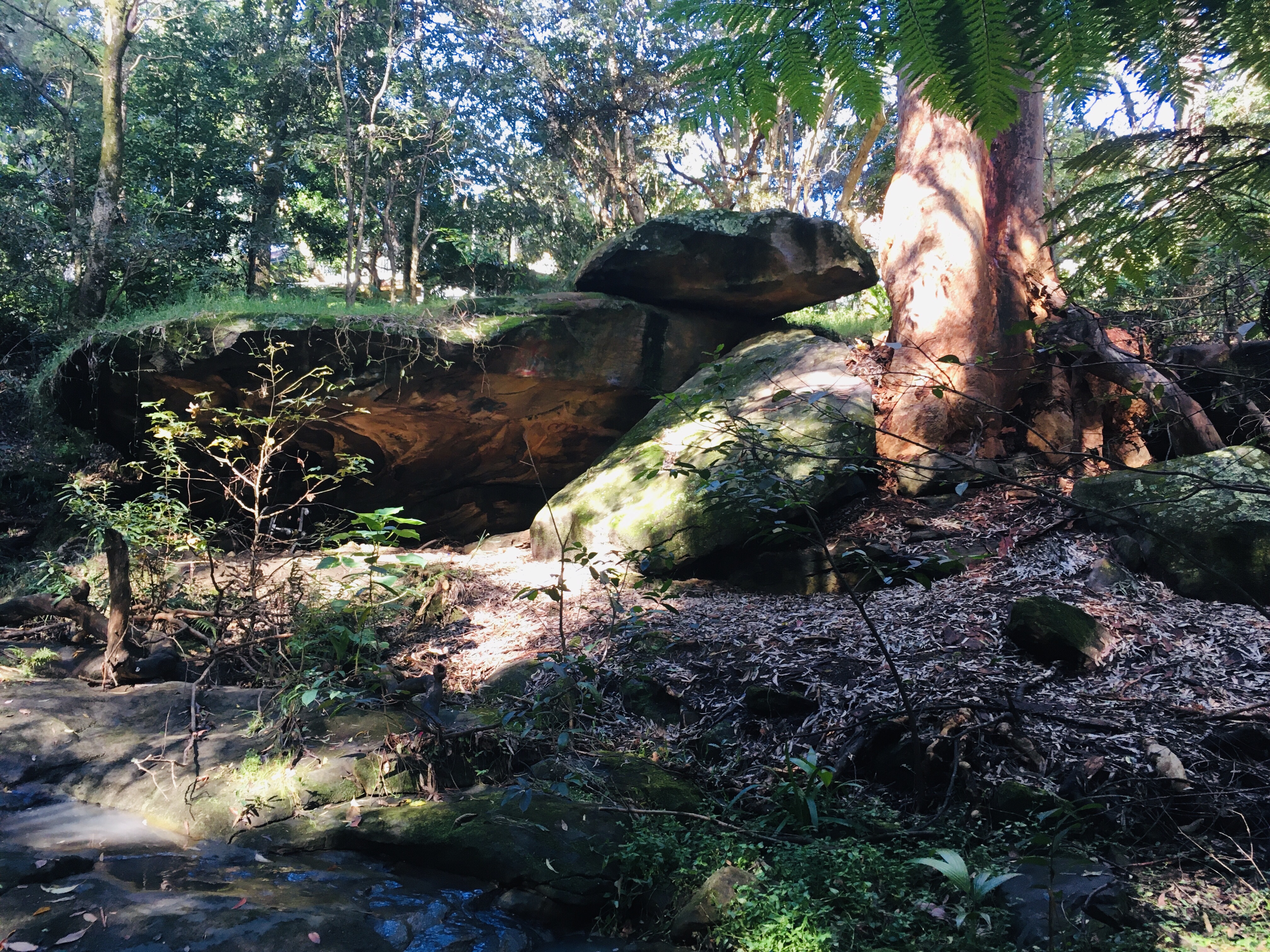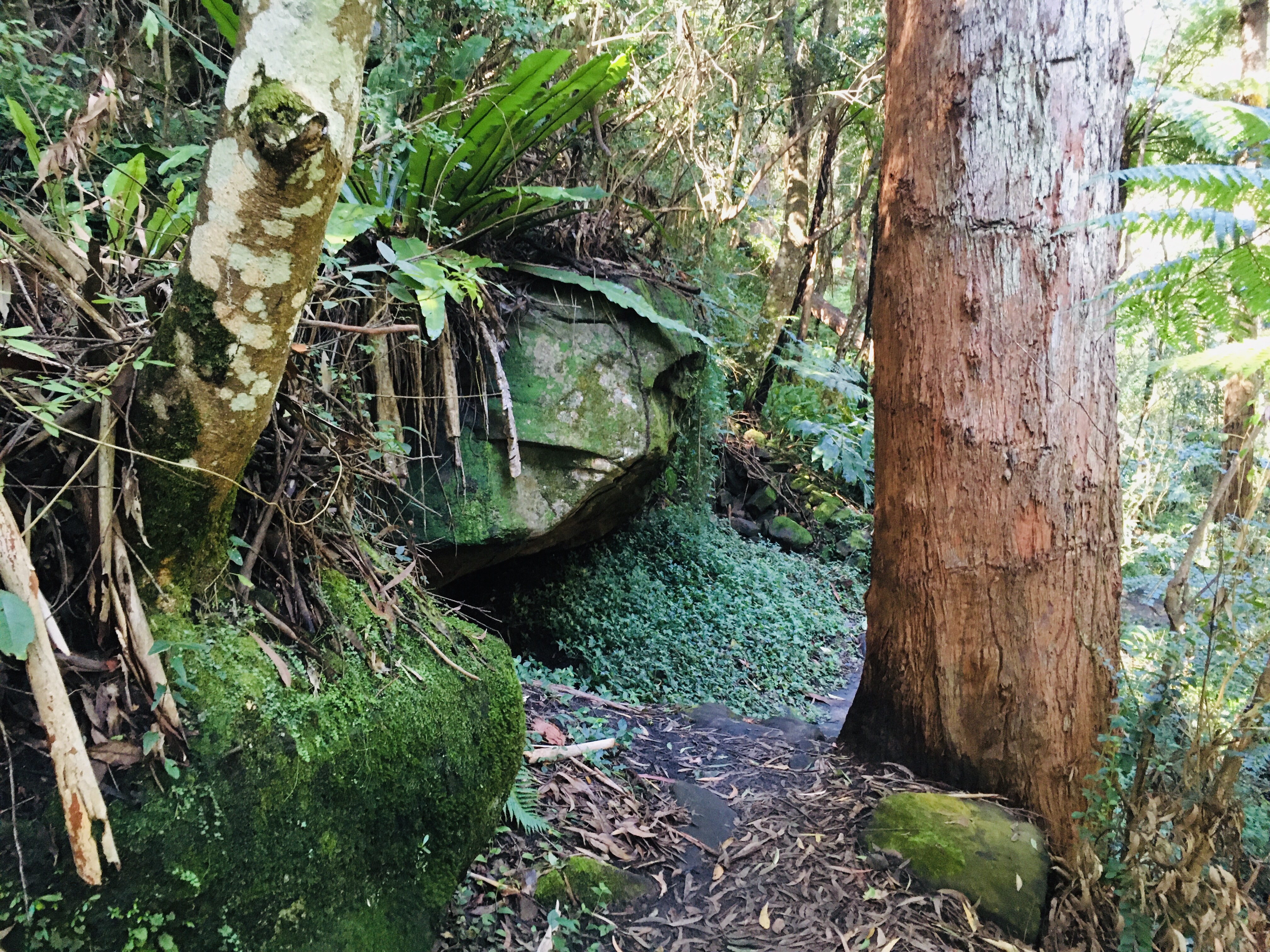 Everything was lush and green. Ferns and mosses and fungi everywhere. This was more like it. There were tall rock walls, a cave and a natural tunnel big enough to walk through. Much better. I lost the track briefly and just walked along the sandstone creek bed until I reconnected to it. Towards the end there was a little waterfall and some rock overhangs that was a really pleasant spot.