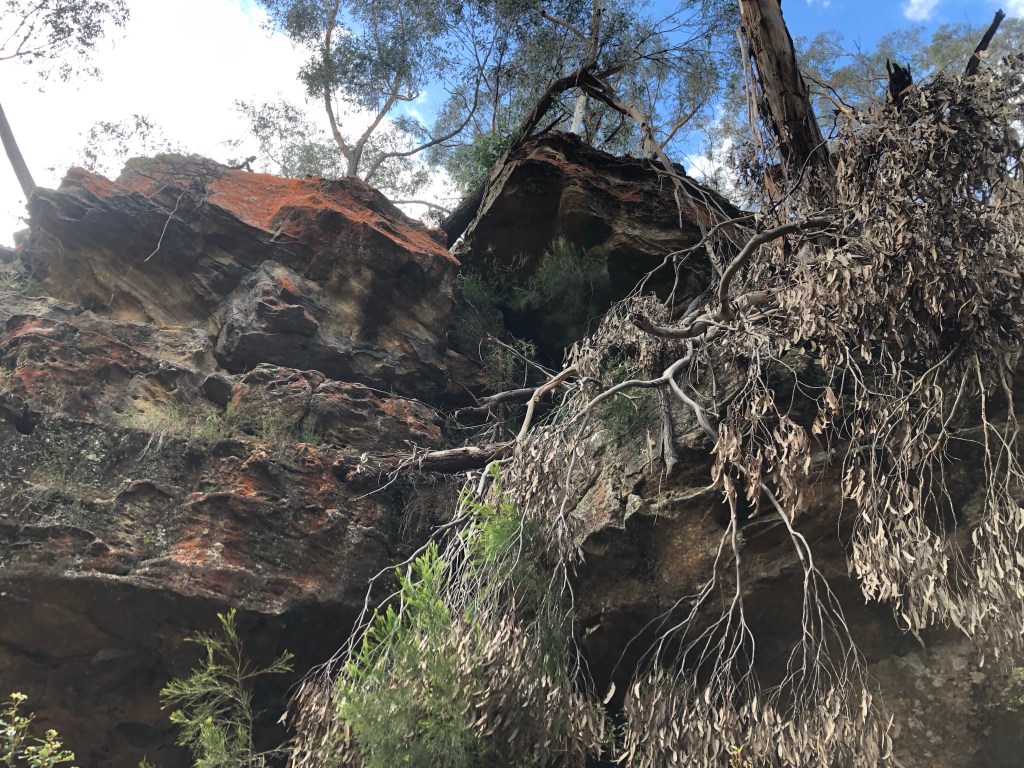There were some strange looking plants along the track, looking like something from lost in space or day of the triffids. At some point I lost the track. There were some fallen trees and little paths leading away and I seem to have taken the wrong one. A look at the map showed the trail only a few meters away so I pushed on up through the bush until I found it again, running alongside a sandstone outcrop.