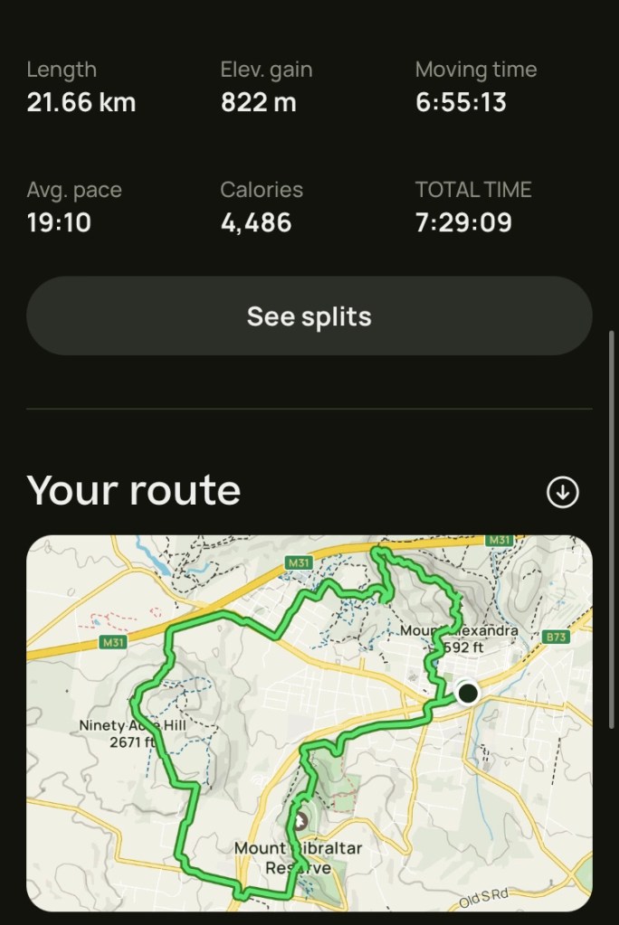 I’d been exercising rather consistently lately to try to improve my fitness and I wanted a bit of a challenge. While playing with the map view on the AllTrails app I stumbled across this walk. Its three peaks, summing to 800m and 21km of walking, would definitely provide that challenge! (Watch the walk on YouTube here)