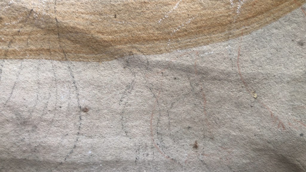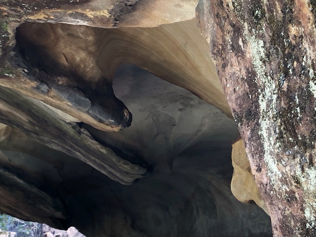 The cave itself looked like a little wave. In its curl, I saw the shape of a wallaby drawn with charcoal. Moving into the cave, I could see red outlines of some sort of bird, perhaps a water bird, then I saw a Goanna (lace monitor) and the more I looked the more I could see. There were more wallabies (I don’t think they were kangaroos), more birds, possibly a possum. It was amazing!
