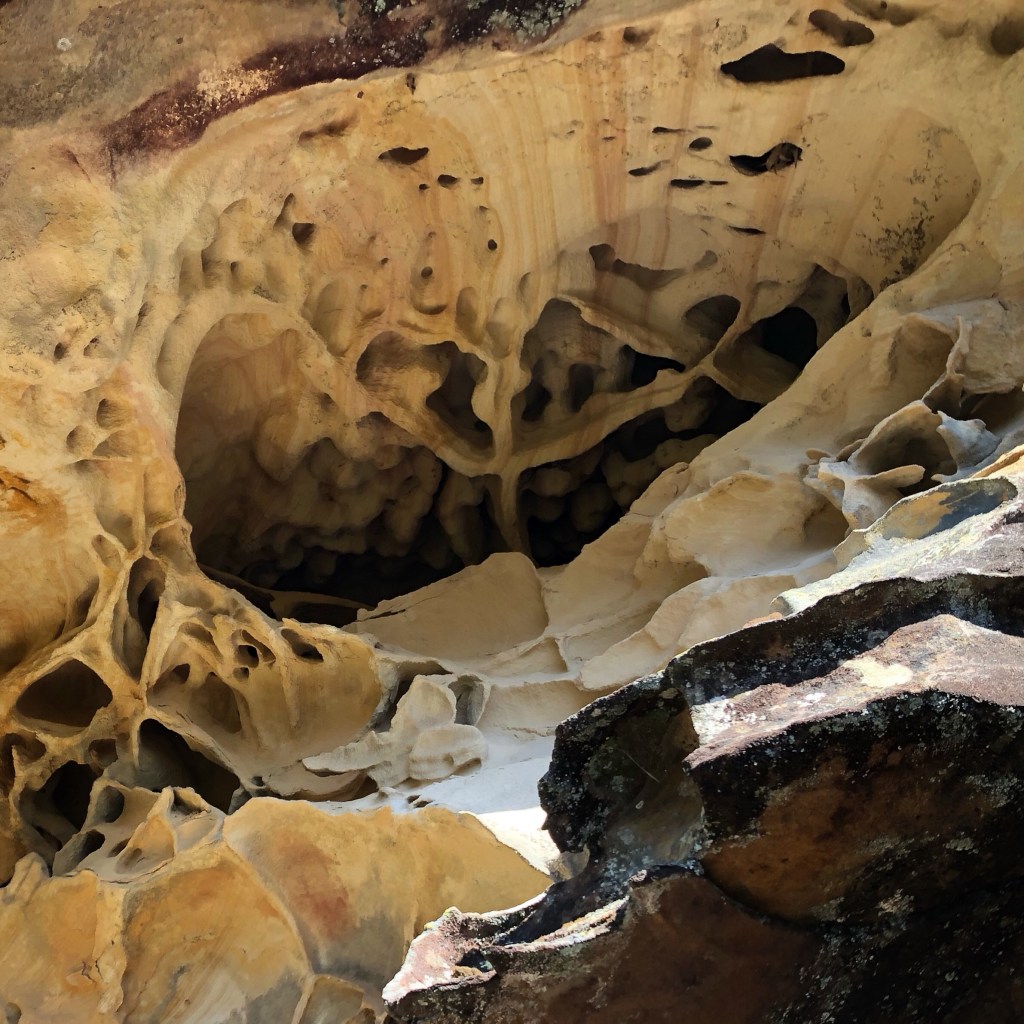 I emerged onto a large set of sandstone boulders with a lovely view. I took a pause here to appreciate where I was. I also realised that the rocks were likely part of the system that held the cave. After a short break I followed a pathway (it was more path than scrub) down and around the rocks. I found an amazing little cave that looked like a throat! I felt the urge to climb up and see inside but resisted and carried on as it looked a bit fragile.