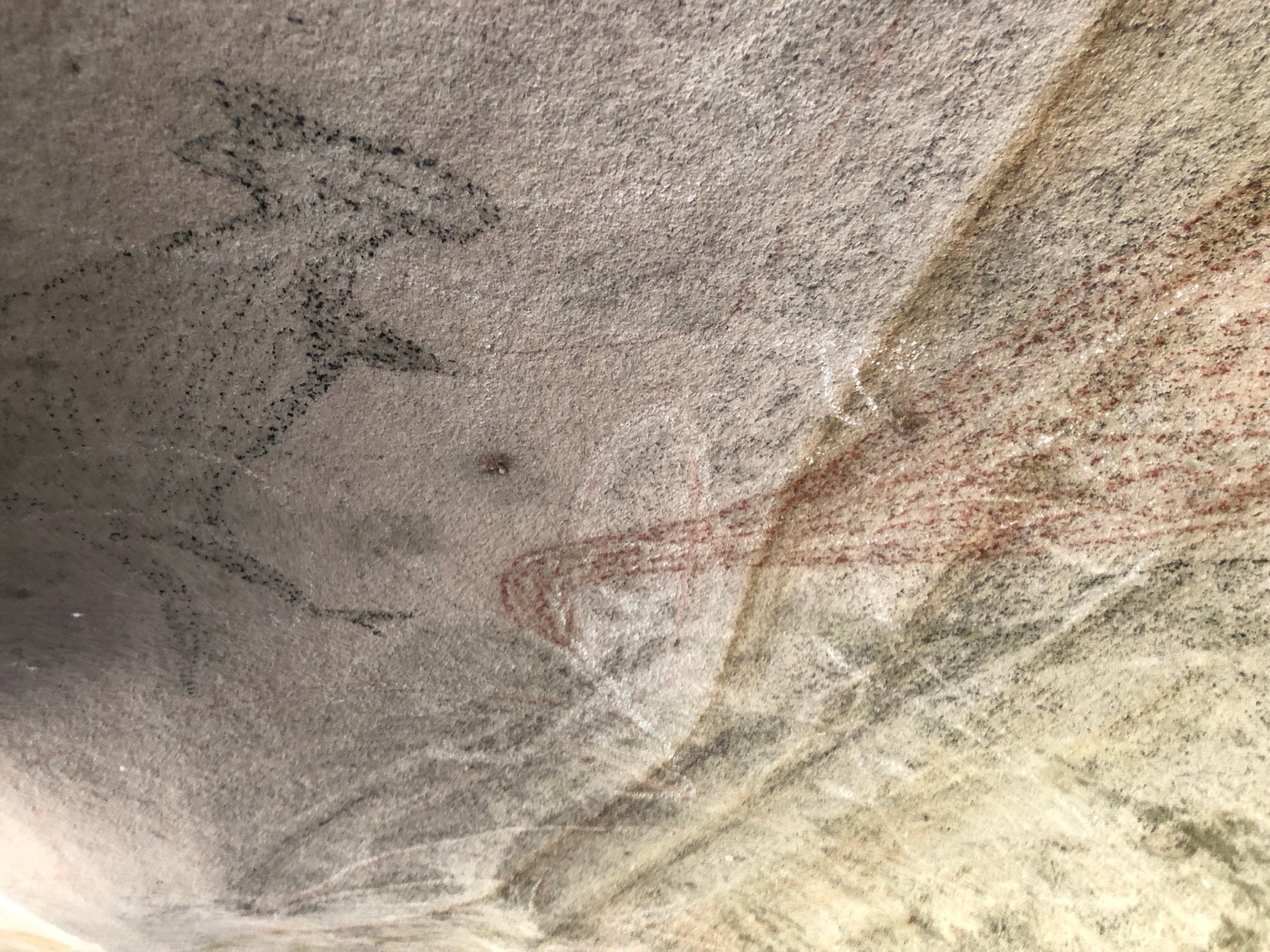 There was a wide, low rock that you could sit on and be perfectly positioned to take in the view of the walls of the cave. I sat there for quite some time, and as I looked closer, I could see there were also white outlines of animals. I could see a kangaroo or wallaby and many more birds in the white lines.