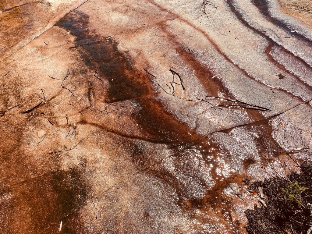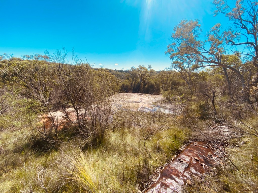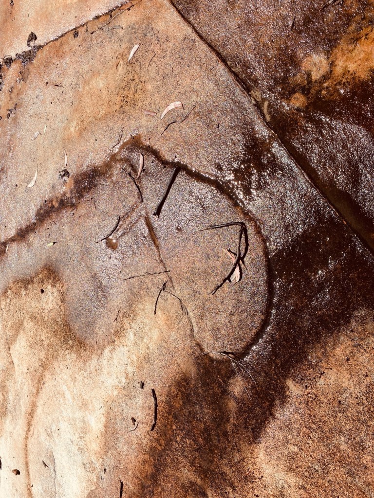 The first bush bash came. I’m always slow as I try not to step on all the plants. I know wallabies will pound them down or possibly eat them but I’ll always try to be as non impactful as I can. (I want my stories to be of exploration not destruction). I weave my way down from the ridge and was met with a wide beautiful rock platform that looked to be a perfect candidate for petroglyphs! It was slippy as water that had seeped down from the upper elevations was trickling over it. I had to sit on my butt and shuffle down one part of it to avoid another fall (I fell and hurt myself a couple of years ago and my side has only just recovered- I wasn’t eager to go through that again!).