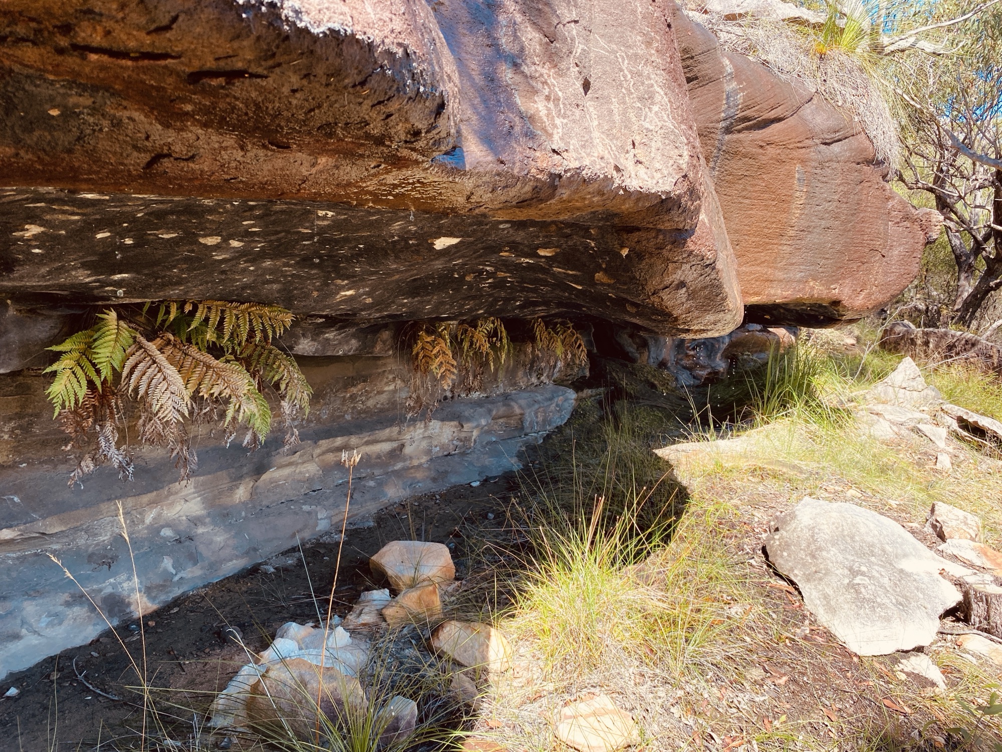 I started back but noticed some more rocky areas so decided to go exploring. I found a long low rock overhang and walked along it. Sure enough I found yet another wallaby carving. It was a nice spot and I could have sat and relaxed for longer than I did. I guessed that maybe the cave with art that I saw online was nearby, but I realised I could be out there all day and not find it. So after a last scout around I headed back up to the ridgeline.
